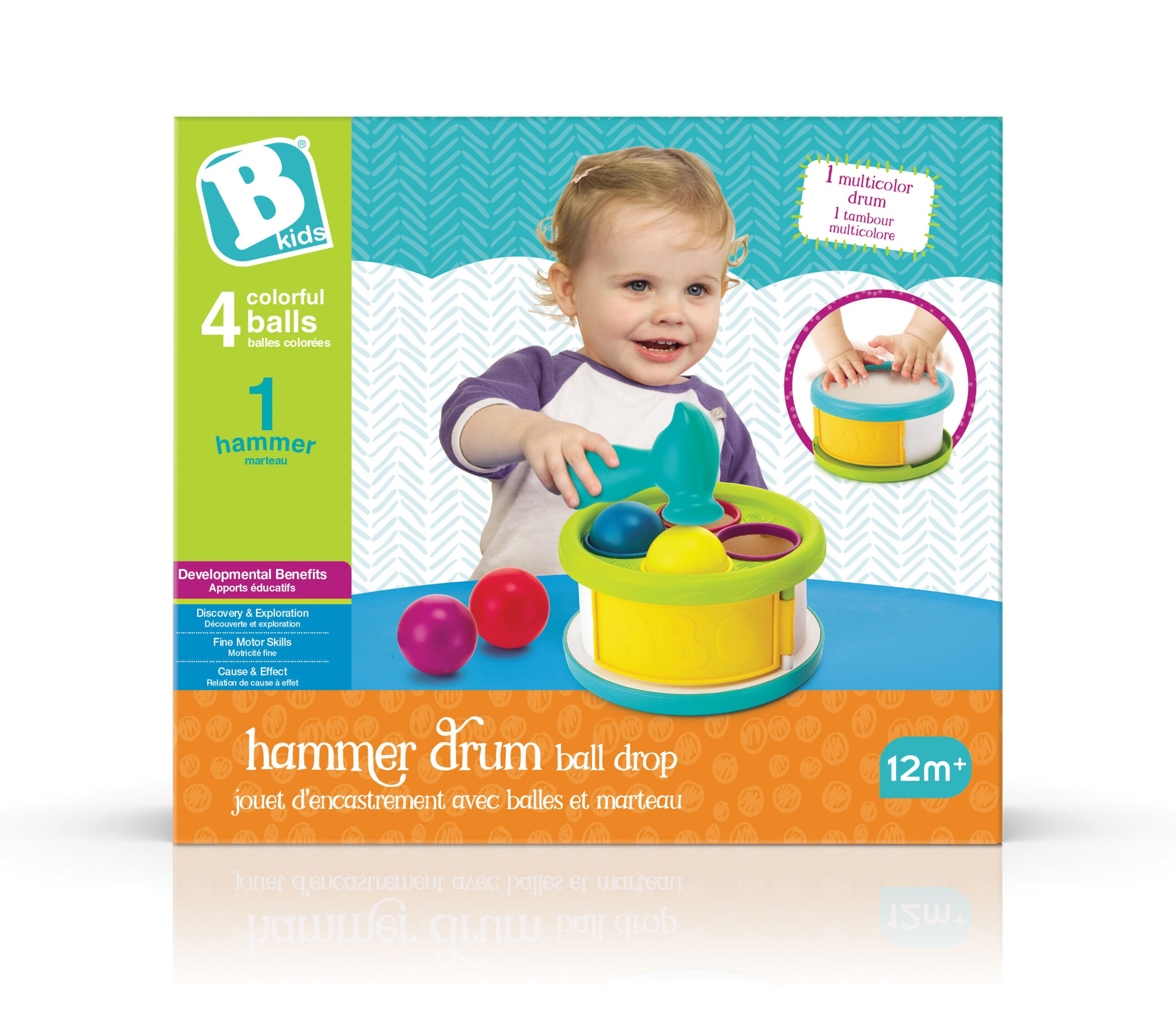 Użyj młotka aby wrzucać kolorowe piłeczki w odpowiednie otwory lub po prostu zagraj na bębenku! W zestawie 4 kolorowe piłeczki, młotek oraz specjalny pojemnik, który może służyć jako bębenek lub jako sortownik kolorowych piłeczek. Jeśli chcesz bawić się od nowa, otwórz drzwi z boku bębenka i wyciągnij piłeczki. Wiek: 12m+