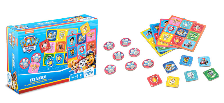 Graj w Bingo razem z Psim Patrolem. Odnajdź wszystkie postaci i odznaki na planszy, przykryj żetonem z łapką i krzycz BINGO!