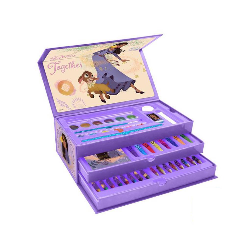Zestaw przyborów dla małego artysty zapakowany w ozdobne pudełko-kuferek. Ma rączkę do wygodnego przenoszenia i 2 wysuwane szufladki.