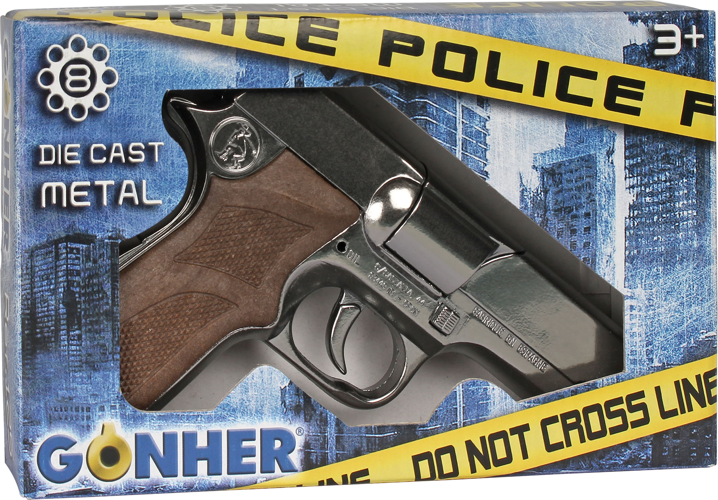 Metalowy pistolet policyjny na 8 naboi z bębenkiem. Wymiary: 17x12cm. Wiek: 3+. Szt./karton: 24