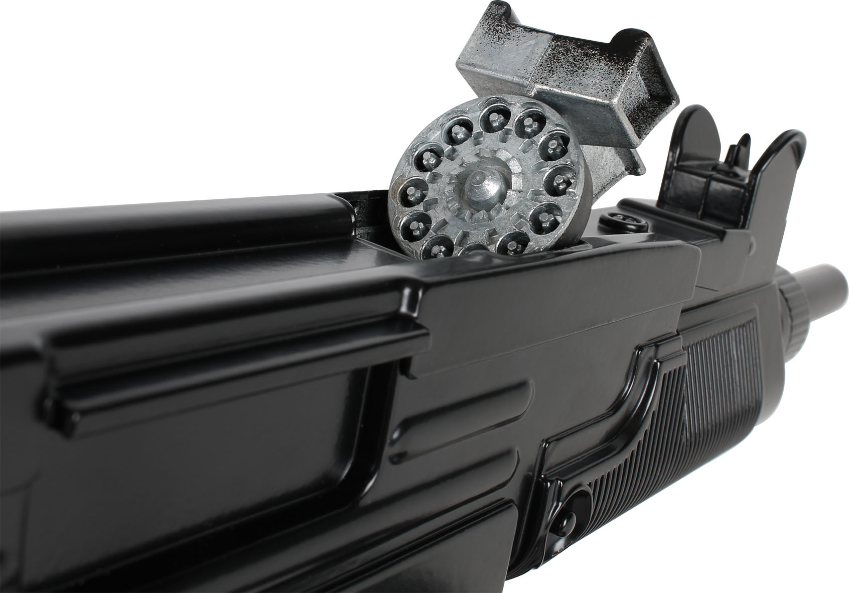 Metalowy karabin maszynowy na pasku na 12 naboi. Wiek: 3+. Wymiary: 47×19,5cm. Szt./karton: 6