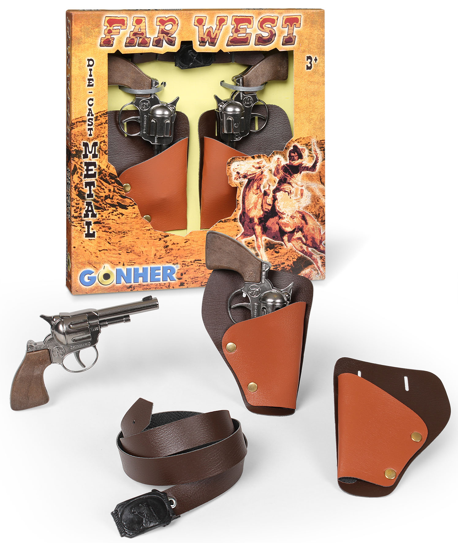 Dwa metalowe rewolwery kowbojskie w zestawie 2 kabury i pasek kowboja z klamrą. Rewolwery nie strzelają nabojami, wydają jedynie dźwięk. Wyprodukowany w Hiszpanii. Wiek: 3+. Szt./karton: 12