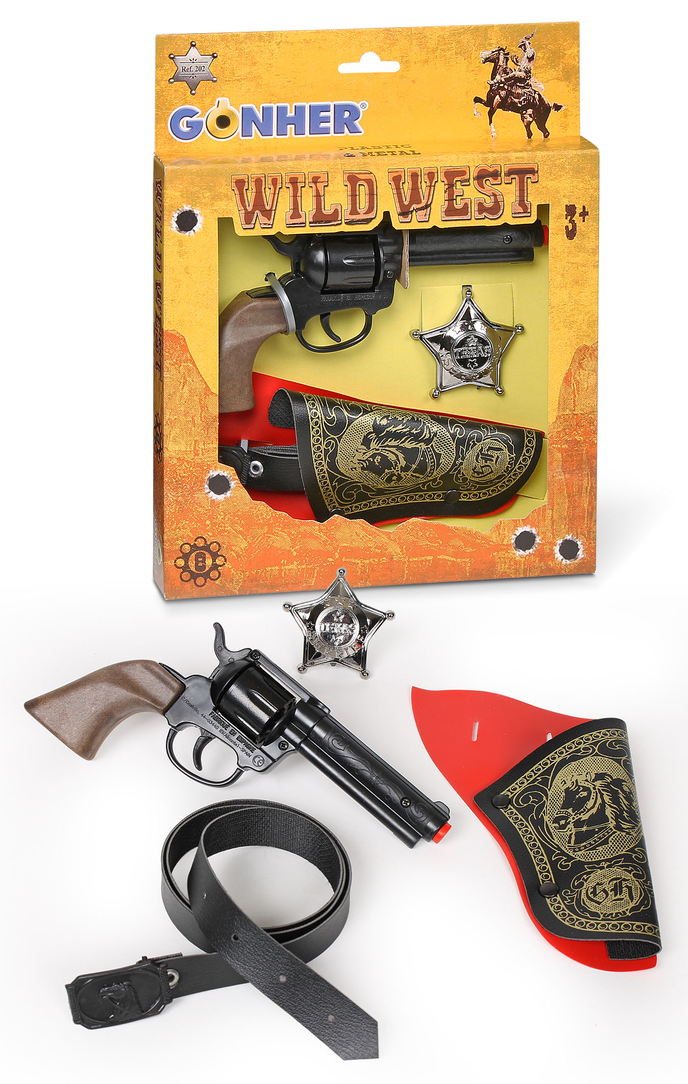 Zestaw zawiera plastikowy rewolwer kowbojski na 8 naboi, kaburę oraz odznakę szeryfa. Wiek: 3+. Szt./karton: 12