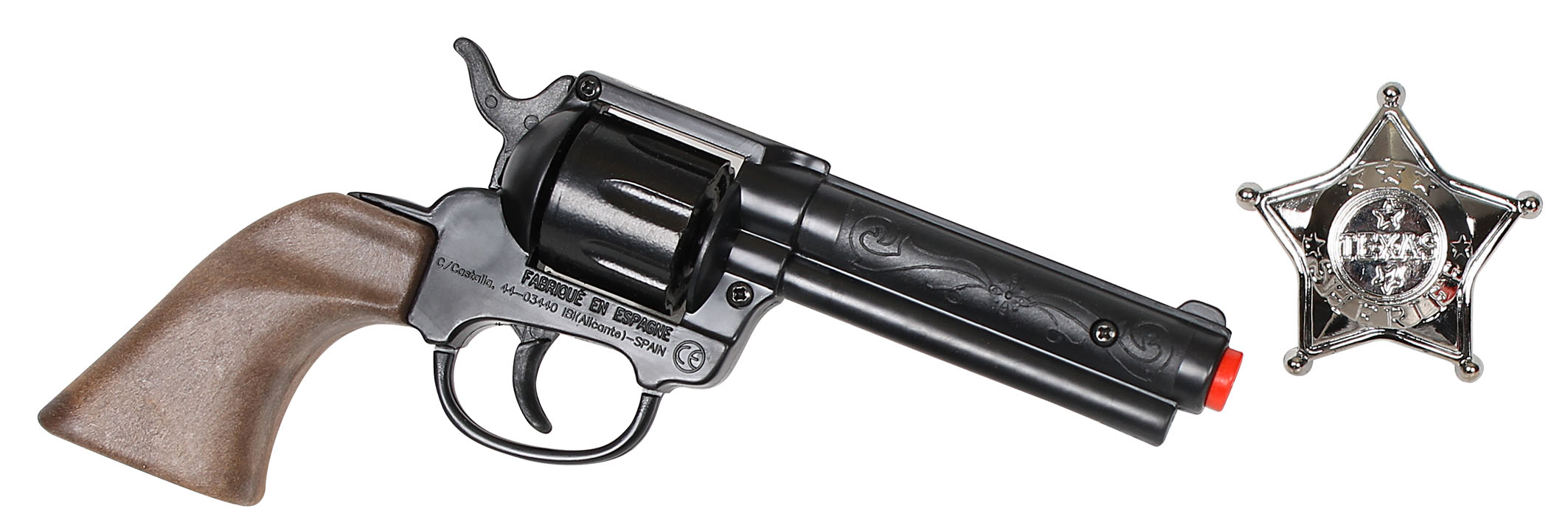 Plastikowy rewolwer kowbojski na 8 naboi z odznaką szeryfa. Wiek: 3+. Szt./karton: 24