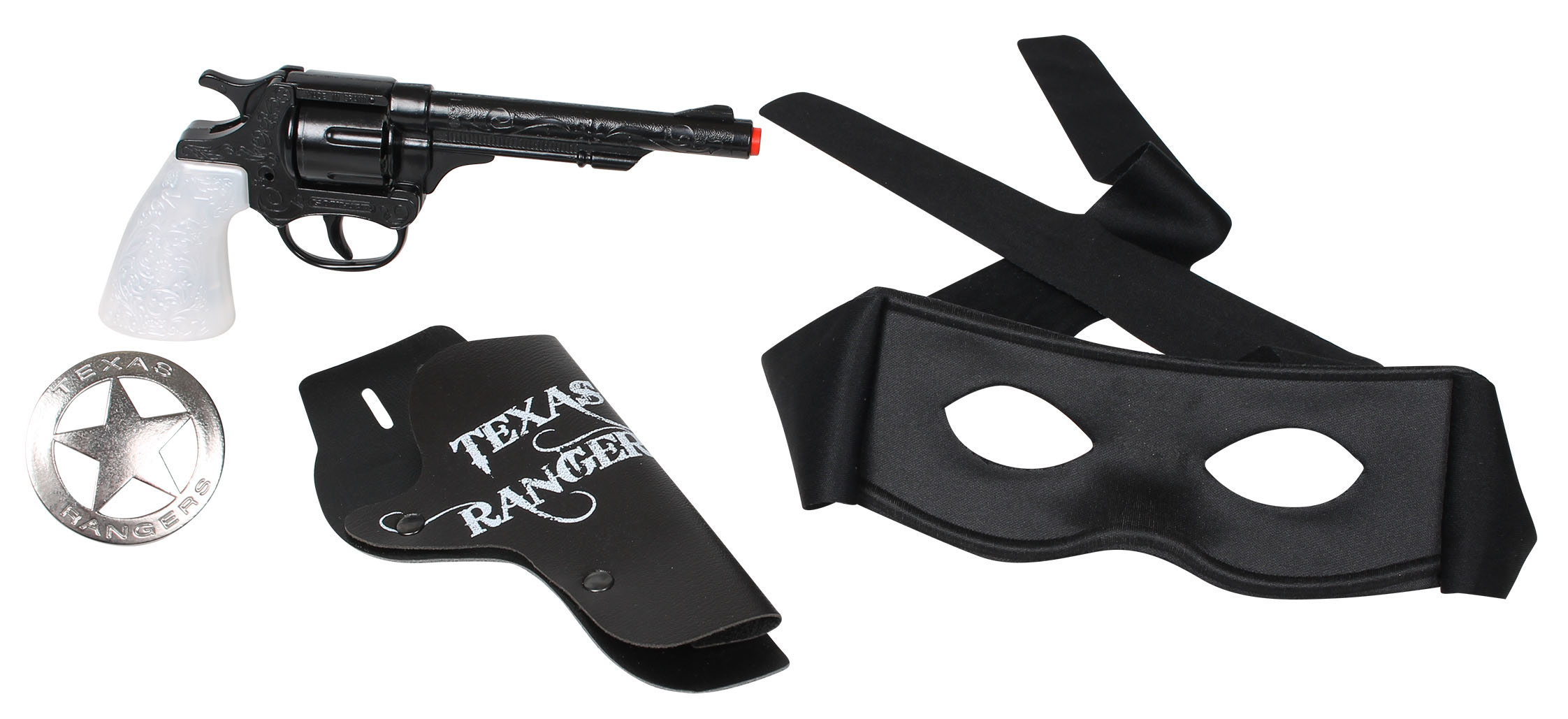 Zestaw zawiera: metalowy rewolwer na 8 naboi z bębenkiem, kaburę, maskę kowboja, odznakę oraz pasek. Wiek: 3+. Szt./karton: 10
