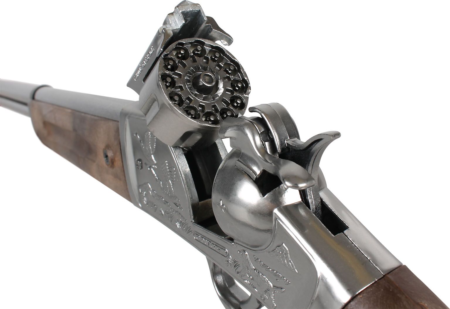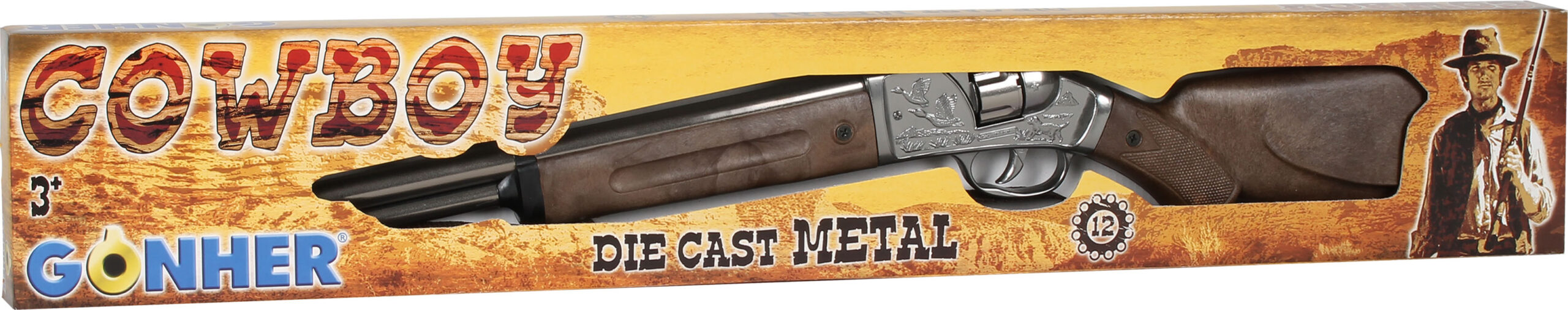 Strzelba kowbojska metalowa na 12 naboi z bębenkiem. Wymiary: 75×17 cm. Wiek: 3+. Szt./karton: 12
