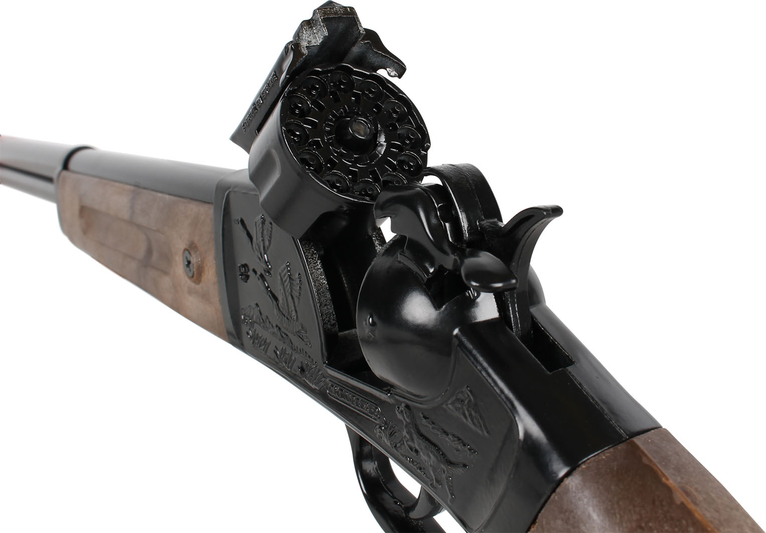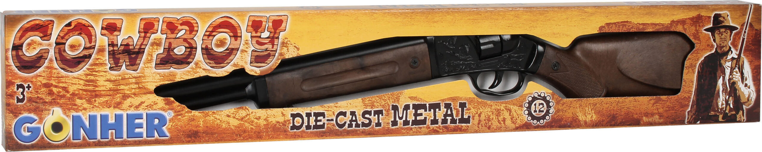 Strzelba kowbojska metalowa na 12 naboi z bębenkiem. Wymiary: 75×17 cm. Wiek: 3+. Szt./karton: 12