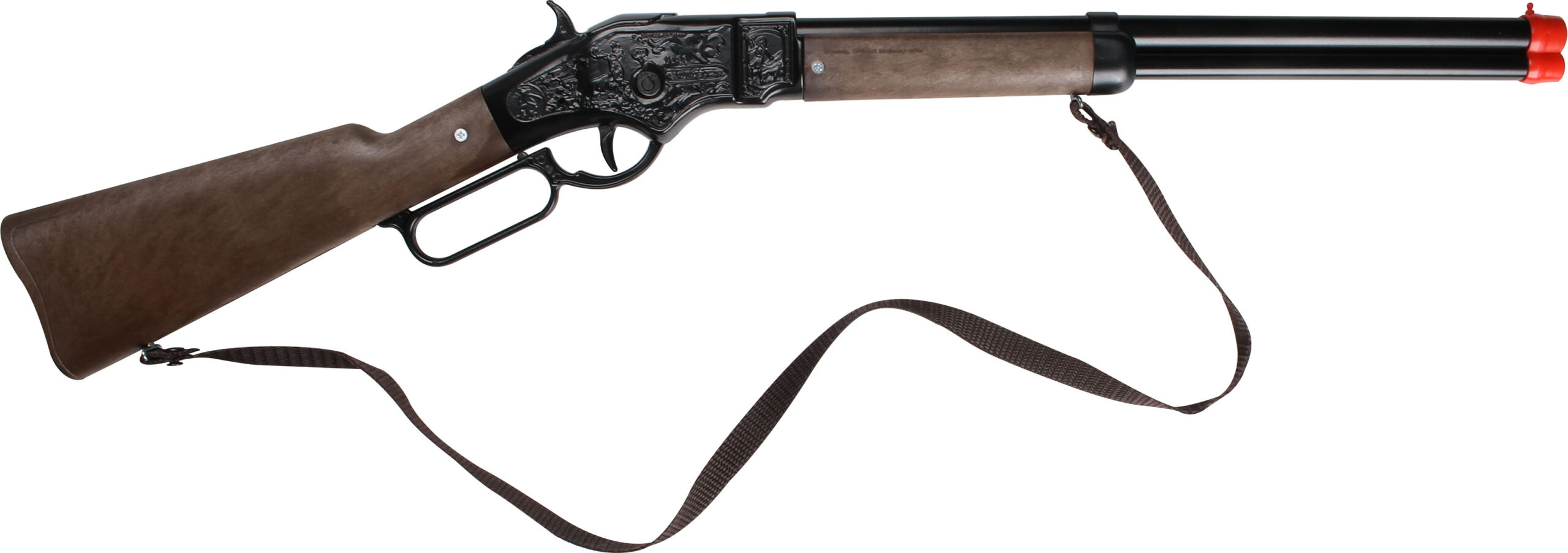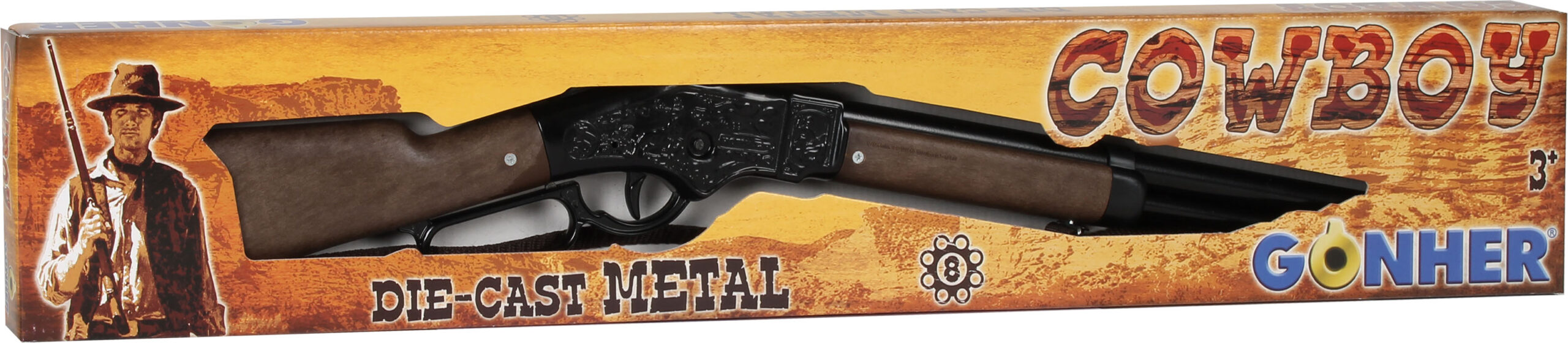 Strzelba kowbojska metalowa na 8 naboi. Wymiary: 68,5x16cm. Wiek: 3+. Szt./karton: 24