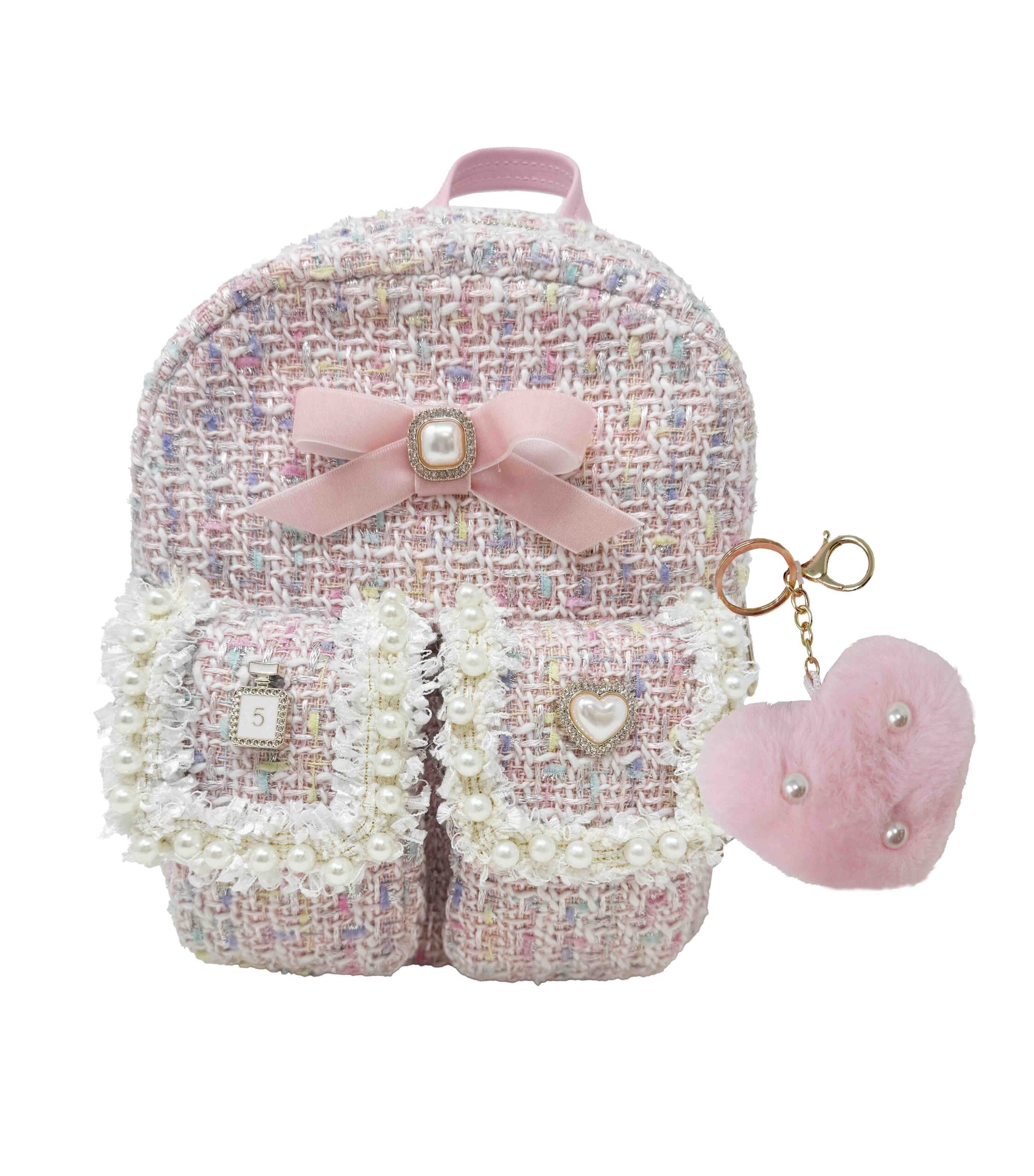 Plecaczek pomieści niezbędne akcesoria małej miłośniczki mody i trendów. Wykonany z materiału tweed i ozdobiony mnóstwem akcesoriów, stylizowany i inspirowany trendami z najbardziej znanych domów mody. Dołączony pasujący miękki pluszowy breloczek dla dodatkowego dekoracyjnego efektu. Zapinany na zamek, zawiera 2 dodatkowe przegródki-kieszonki na magnetyczny guziczek oraz 1 dodatkową przegródkę w środku. Rączka i regulowane paski wykonane z materiału imitującego skórę. Wiek: 5+
