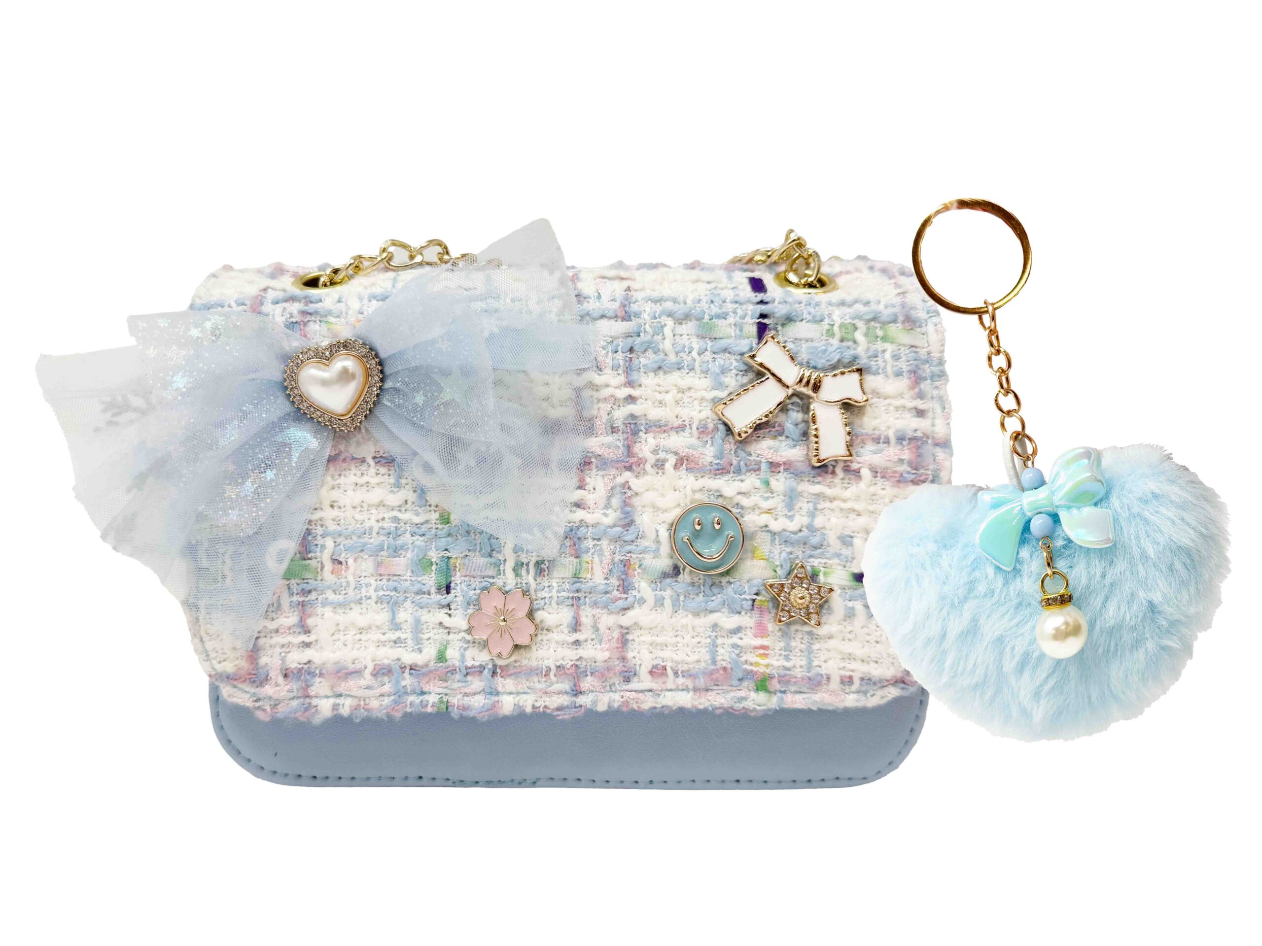 Torebeczka pomieści niezbędne akcesoria małej miłośniczki mody i trendów. Wykonana z materiału tweed i ozdobiona mnóstwem akcesoriów. Dołączony pasujący miękki breloczek dla dodatkowego dekoracyjnego efektu. Torebeczkę nosi się na modnym złotym łańcuszku. Zapinana na magnetyczny guziczek. Przód torebki został ozdobiony kokardką. Wiek: 5+