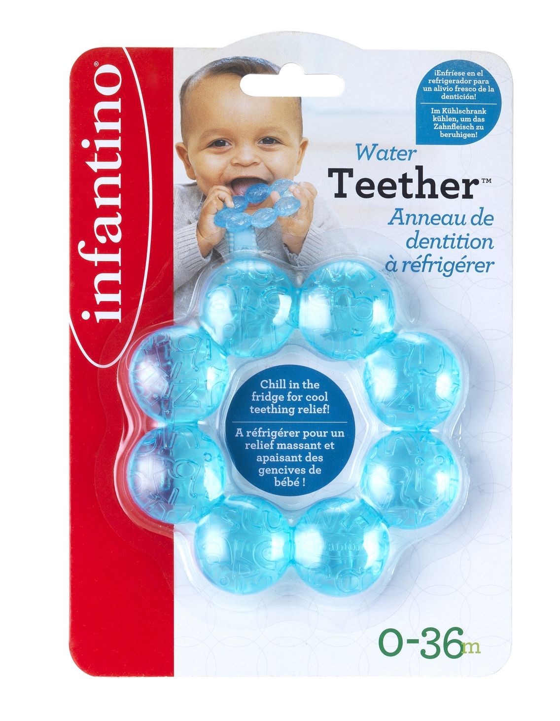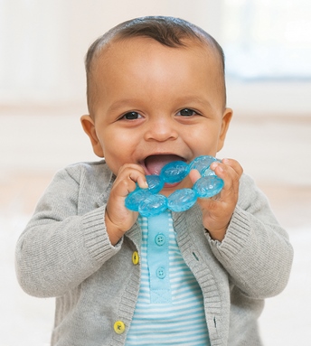 Gryzaczek wodny w kształcie połączonych ze sobą koralików. Na koralikach zostały nadrukowane literki, które tworzą różne faktury. Należy schłodzić w lodówce aby przynieść ulgę w ząbkowaniu! Wiek: 0M-36M. Szt./karton: 12