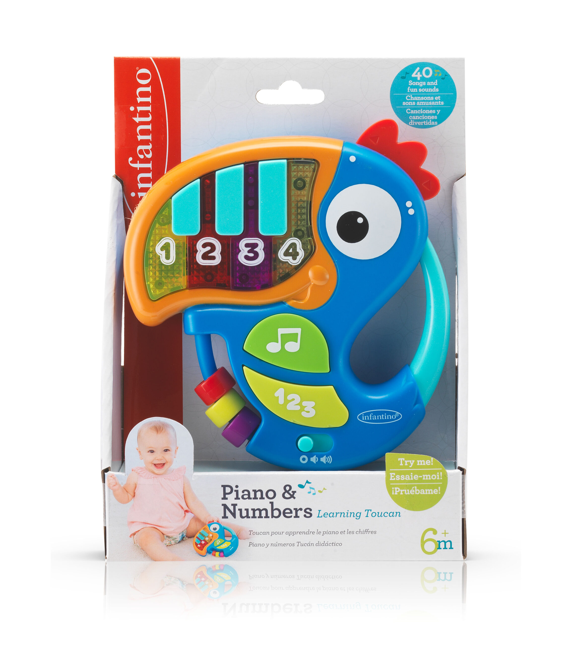 Pianinko w kształcie tukana to idealna zabawka edukacyjna. Wyposażone jest w 4 kolorowe przyciski, które po naciśnięciu migają w rytm muzyki. Pianinko gra wesołe melodie oraz wydaje efekty dźwiękowe i świetlne. Zabawka działa w 2 trybach, które przełącza się grzebieniem na czubku głowy tukana. Pianinko jest niewielkie i poręczne, można zabrać je ze sobą wszędzie. Wymiary pianinka: szer. 13,5 cm x wys. 15 cm. Wymiary opakowania: szer. 15 cm x wys. 20,5 cm. Wymagane baterie: 2xAAA (ZAWARTE W ZESTAWIE). Wiek: 6-36M.