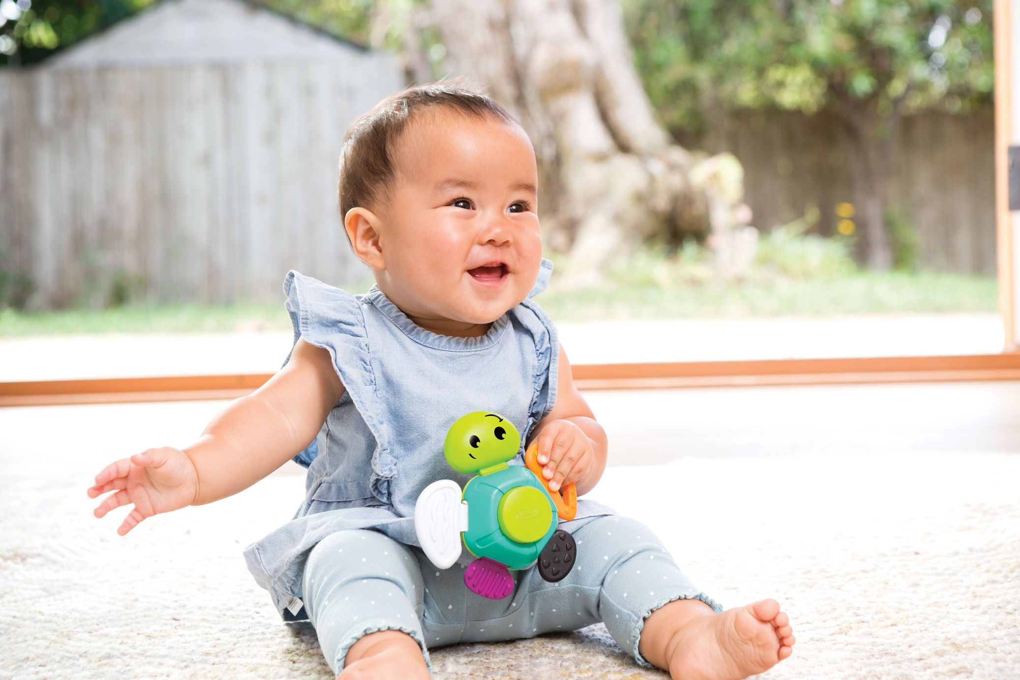 Wesoły żółwik to jednocześnie gryzaczek, piszczałka i grzechotka. Każda płetwa ma inny kształt i fakturę wzbudzającą ciekawość maluszków. Wydaje dźwięki klikania. Na skorupie umieszczona została piszczałka. Wiek: 0M+.