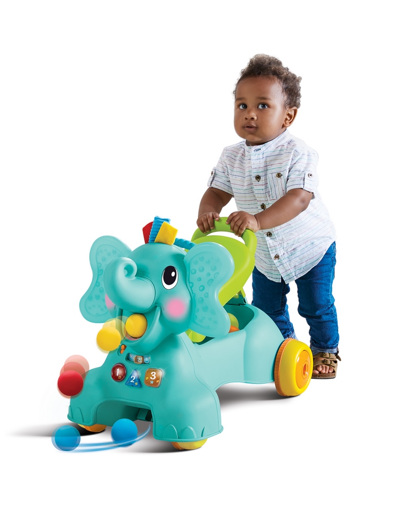 Tym jeździkiem można się bawić na wiele różnych sposobów. Można go używać jako centrum zabawy (6M+), pchacz (12M+) lub jeździk (16M+). Siedzące dzieci uczą się kolorów, kształtów i liczb na podstawie podświetlanych przycisków i dźwięków. Gdy dziecko stawia pierwsze kroki, może trzymać się uchwytu z tyłu siedziska. Siedzisko podnosi się do chodzenia, a opuszcza się do jeżdżenia, zawiera również schowek na piłki. Jeździk słoń gra 3 wesołe melodie oraz wydaje 20 efektów dźwiękowych i świetlnych. Posiada miękkie uszy z wypustkami do chwytania i gryzienia. Prędkość kół można regulować dla początkujących i zaawansowanych spacerowiczów. Jeździk zawiera 5 kolorowych piłek, które można umieścić w koszyku na przodzie lub w schowku pod siedziskiem. Słoń zbiera rozrzucone piłeczki, a następnie wyrzuca je na podłogę lub do koszyka. 2 prędkości kół (regulowane na tylnych kołach). Zalety: rozwija umiejętności,wyobraźnię, ćwiczy koordynację ruchową dziecka. Wesołe kolory przyciągną uwagę każdego maluszka. Wymiary opakowania: szer. 60,5 cm, wys. 40,5 cm. gł. 20 cm. Zabawka wymaga 2 baterii 1,5V AA – NIEZAWARTE W ZESTAWIE.