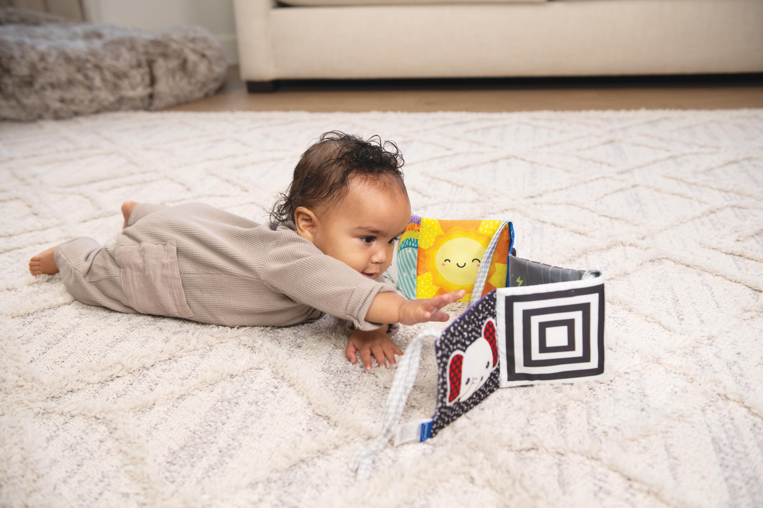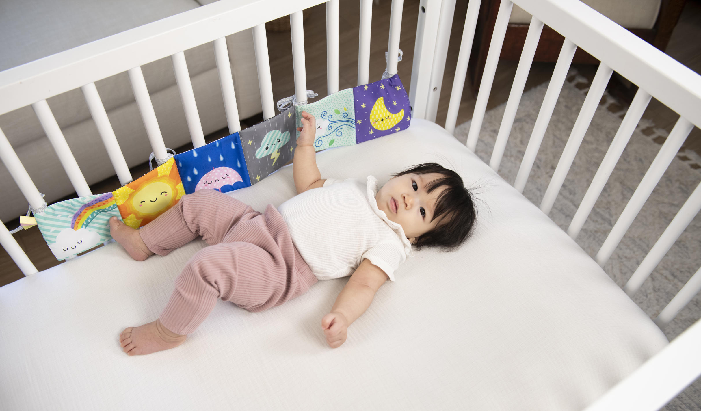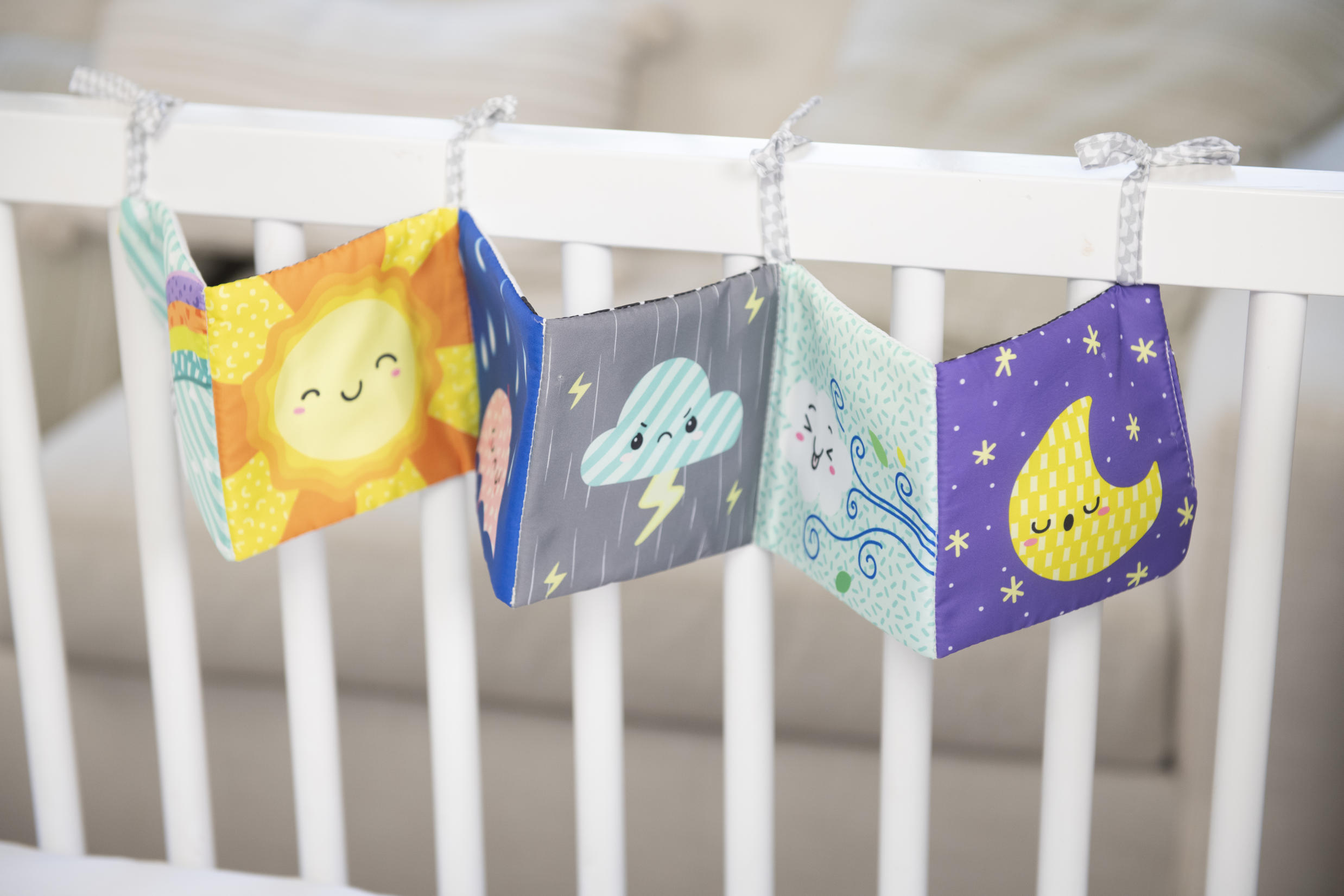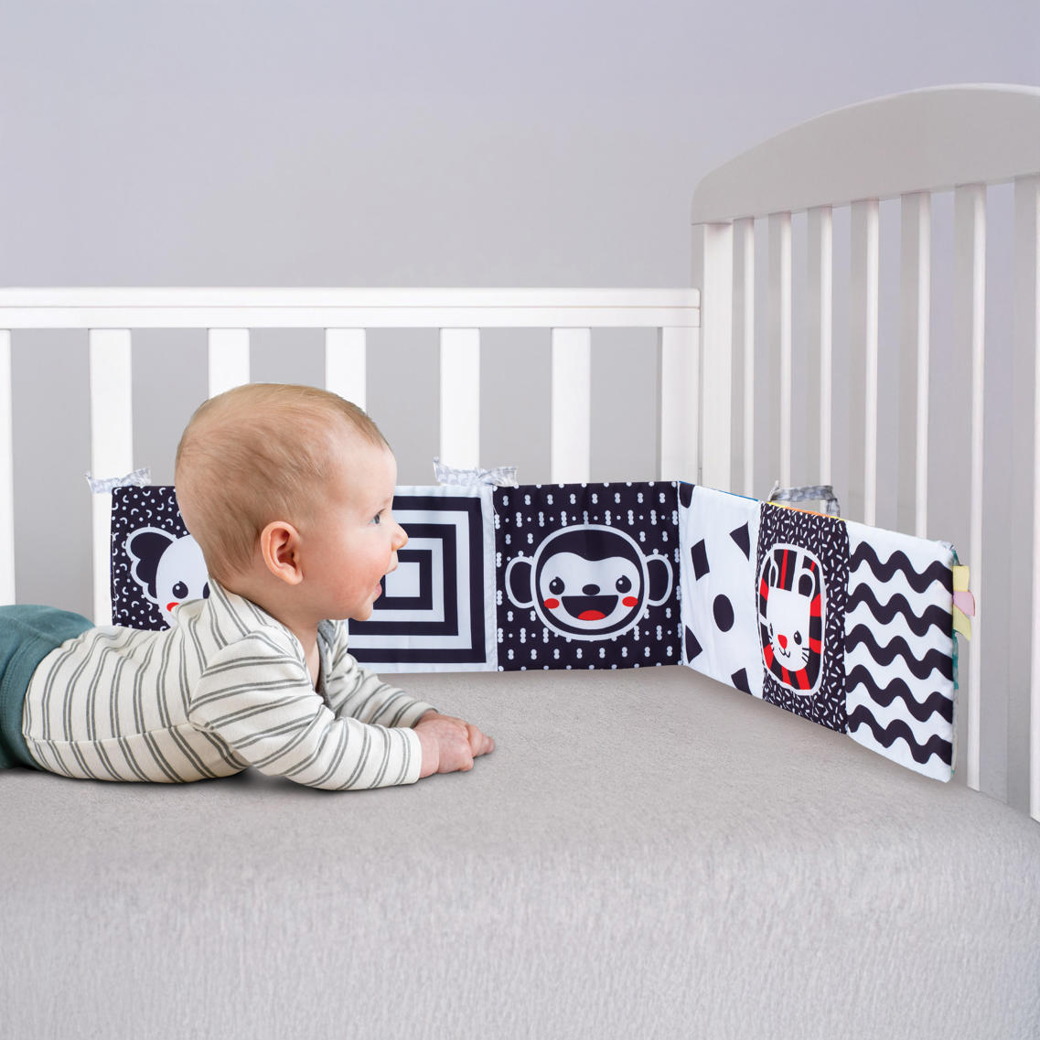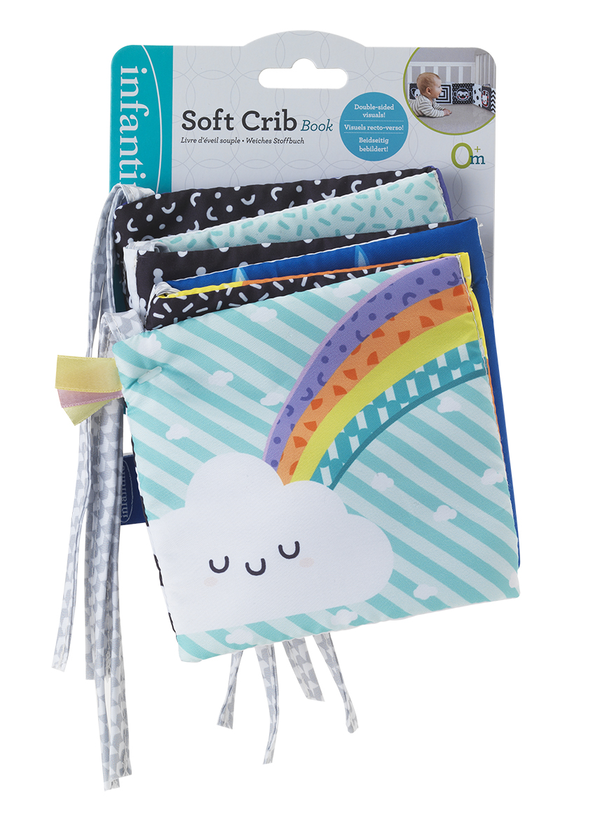 Miękka książeczka, która rozwija się jak harmonijka. Na każdej 'stronie’ inny motyw i kolory. Jedna część kolorowa, a druga w kontrastowej czerni i bieli. Zawiera sznureczki do przywiązania w dowolnym miejscu. Wiek: 0m+