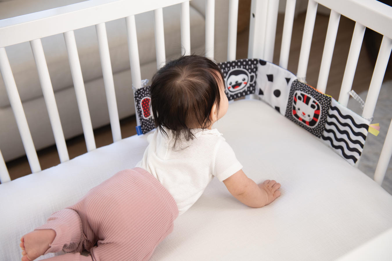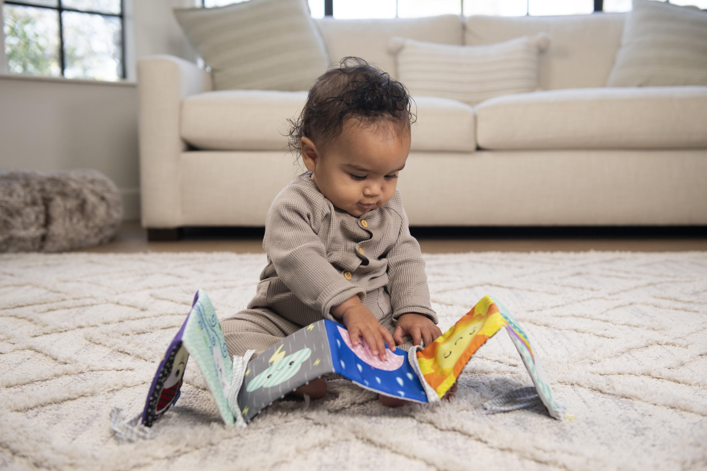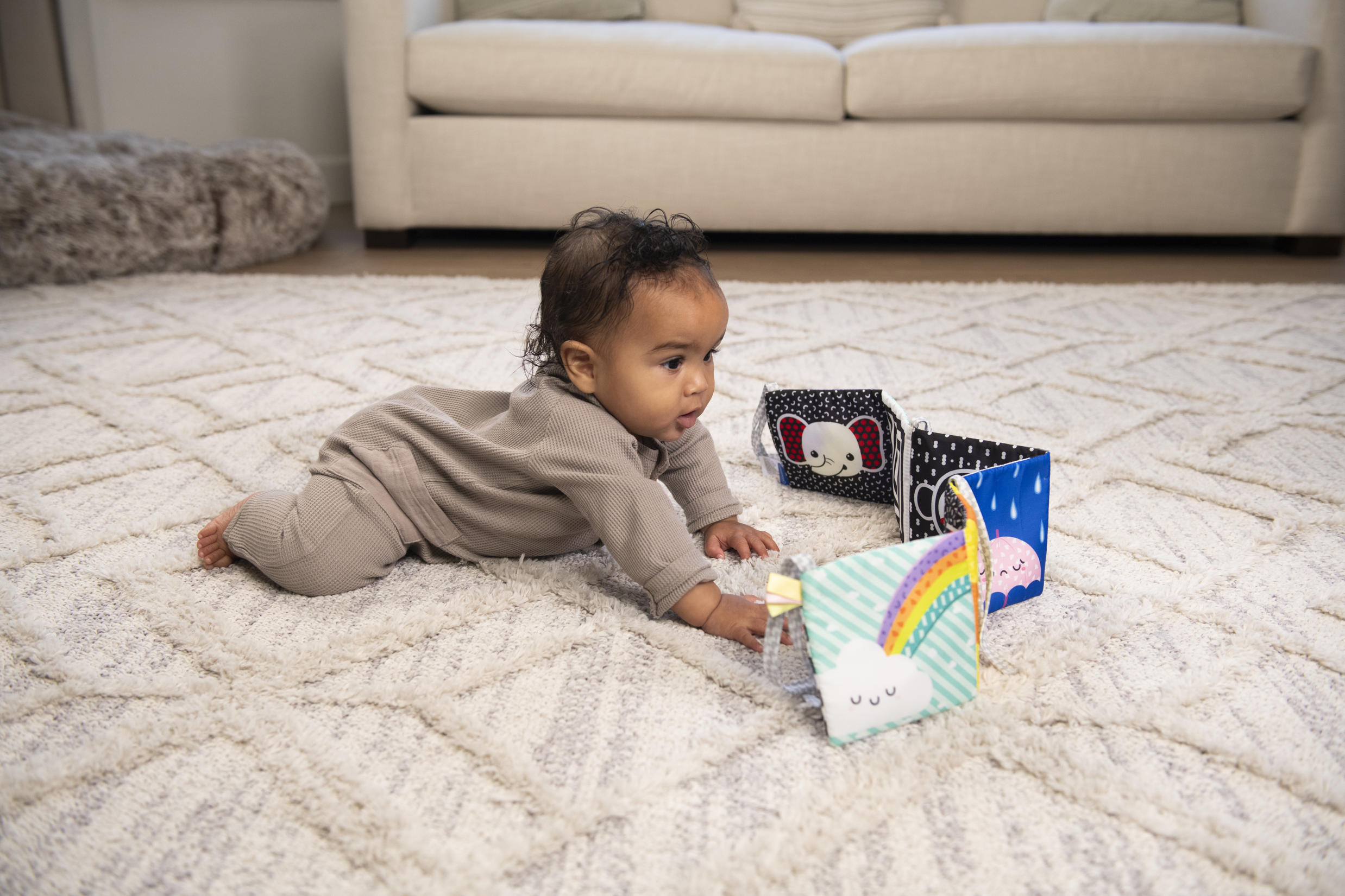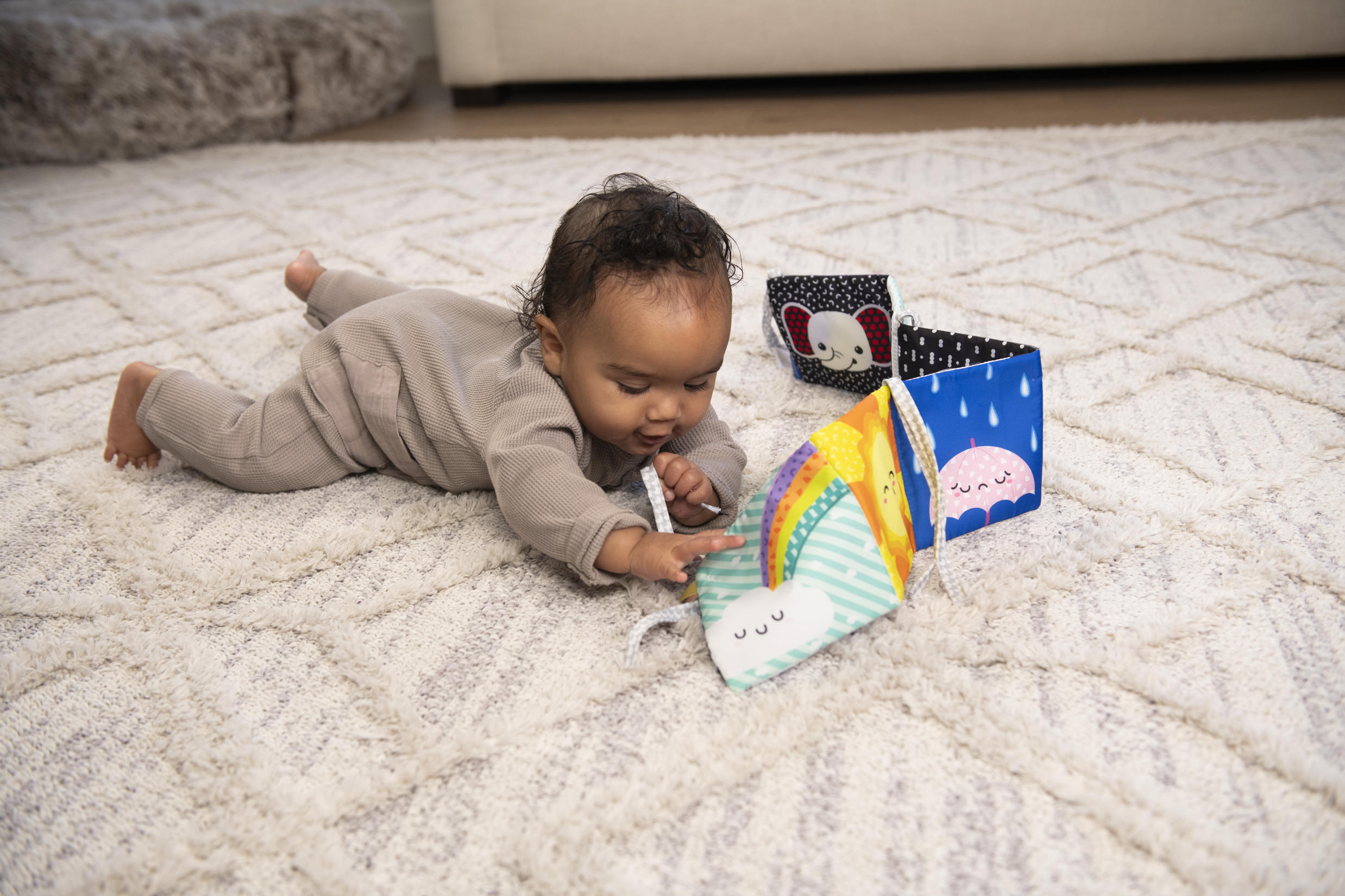 Miękka książeczka, która rozwija się jak harmonijka. Na każdej 'stronie’ inny motyw i kolory. Jedna część kolorowa, a druga w kontrastowej czerni i bieli. Zawiera sznureczki do przywiązania w dowolnym miejscu. Wiek: 0m+