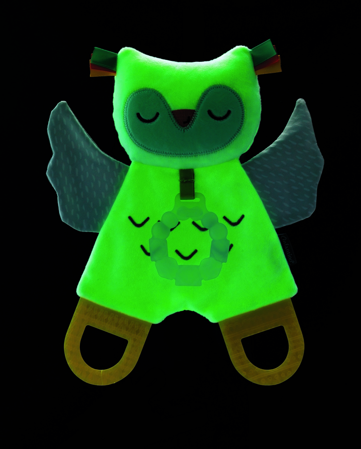 Sówka ma miękką pluszową głowę i szeleszczące ciało, a jej nogi to dwa miękkie gryzaczki. Ma dodatkowy okrągły gryzaczek zawieszony na szyi. Sówka jest wykonana ze spacjalnego materiału pokrytego fluorescencyjną warstwą dzięki czemu będzie świecić w ciemności! Nie zawiera BPA. Wiek: 0M+.