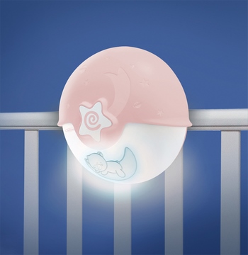 Urządzenie jest jednocześnie projektorem i lampką nocną, w zależności od ustawienia. Projektor wyświetla gwiazdki na suficie, delikatnie usypiające Twoje maleństwo. Po przekręceniu, urządzenie zamienia się w lampkę nocną, która świeci delikatnym światłem, idealnym do przespania całej nocy. Wiek: 0m+. Wymagane baterie: 3xAA