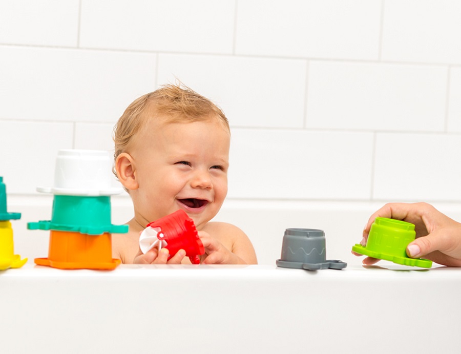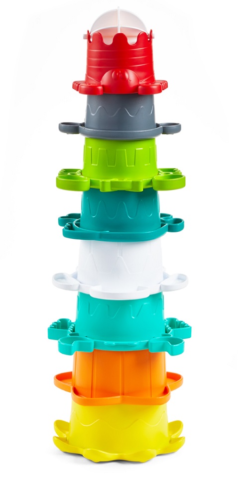 2) KĄPIELOWE KUBKI ZWIERZĄTKA – Kolorowe kubeczki przedstawiające różne zwierzęta wodne, które można dowolnie układać. Różne faktury stymulują zmysł dotyku. Doskonała zabawka zarówno do wanny jak i na plażę. 8 kubków.