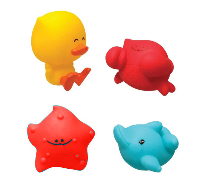 4) PSIKAWKI ZWIERZĄTKA – 4 psikawki w kształcie zwierzątek (delfin, kaczuszka, rozgwiazda, krab). Wystarczy ściśniętą zabawkę zanurzyć pod wodę i puścić, aby nabrać wody do środka, a następnie ścisnąć zabawkę aby poleciał strumień wody. Klocki wykonane z gumy.