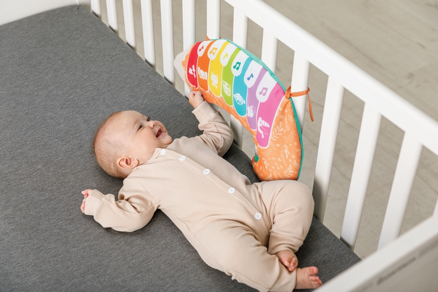 Miękkie pianinko ze zwierzątkami, które można przywiązać do łóżeczka dzięki tasiemkom. Po naciśnięciu jednego z 7 klawiszy dziecko usłyszy odgłosy jakie wydają poszczególne zwierzątka (łącznie 35 dźwięków). Dodatkowa poduszka w kształcie rogala będzie idealna do zabawy na brzuszku. Zawiera lusterko oraz gryzaczek, które można odczepić i używać jako osobne zabawki. Wiek: 0M+