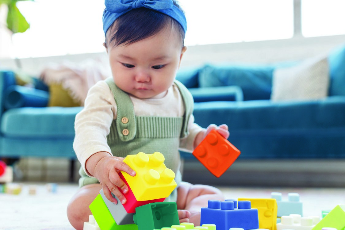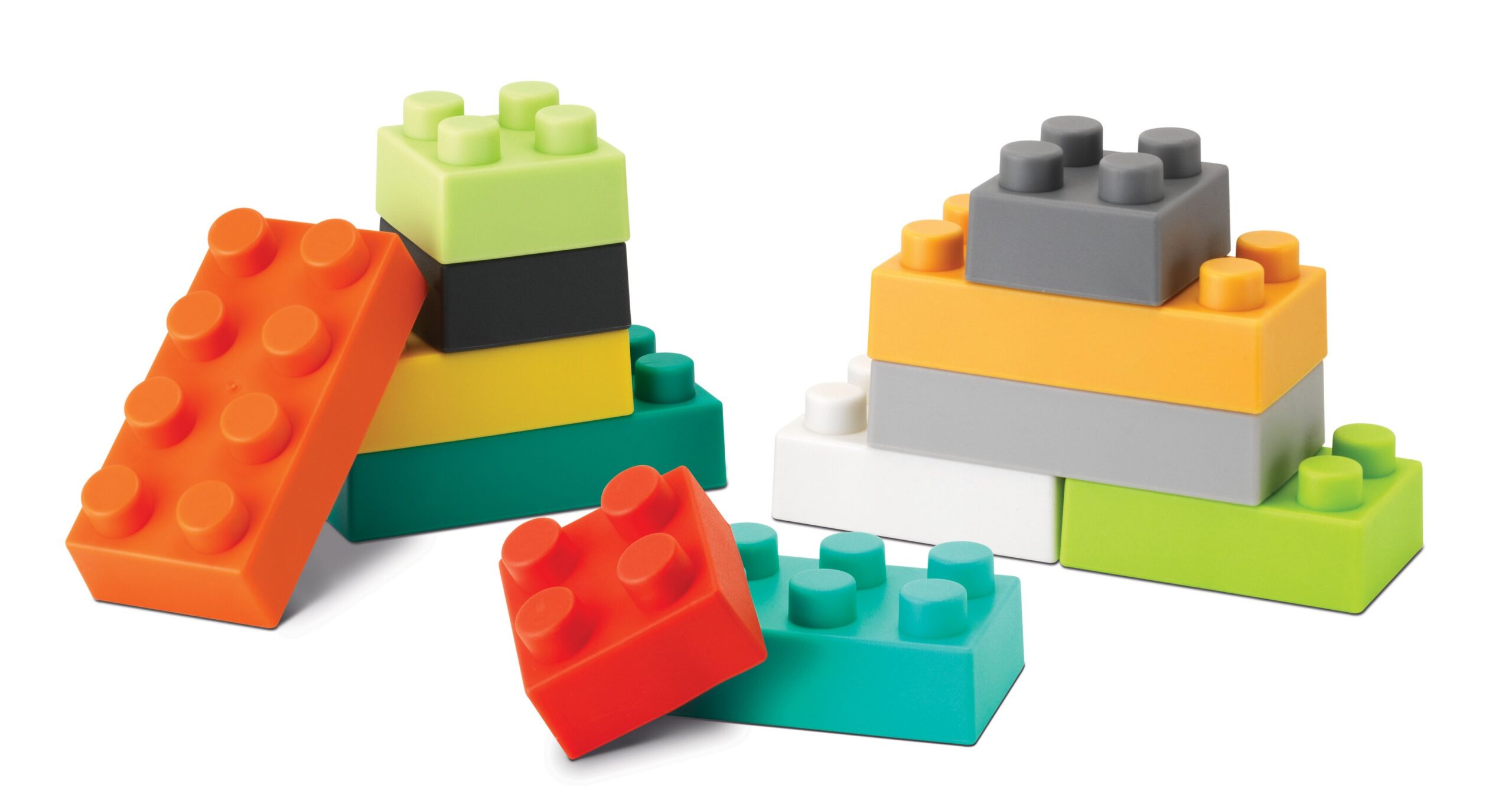 Miękkie gumowe klocki w klasycznym kształcie do budowania, różne rozmiary i kolory. W zestawie 12 sztuk. Wiek: 0M+