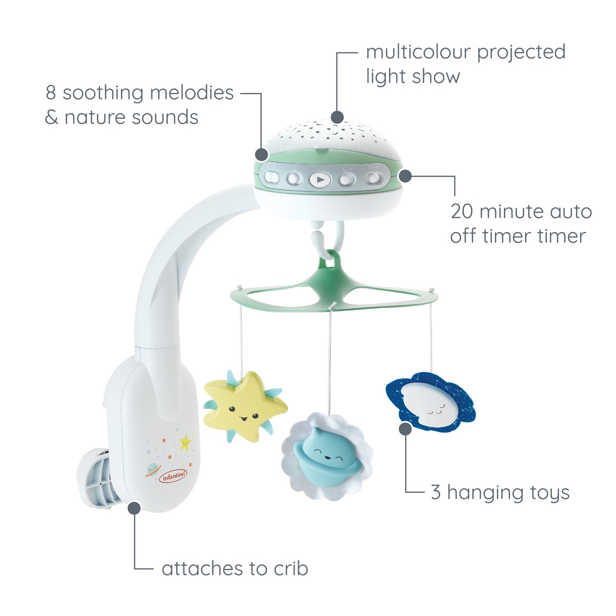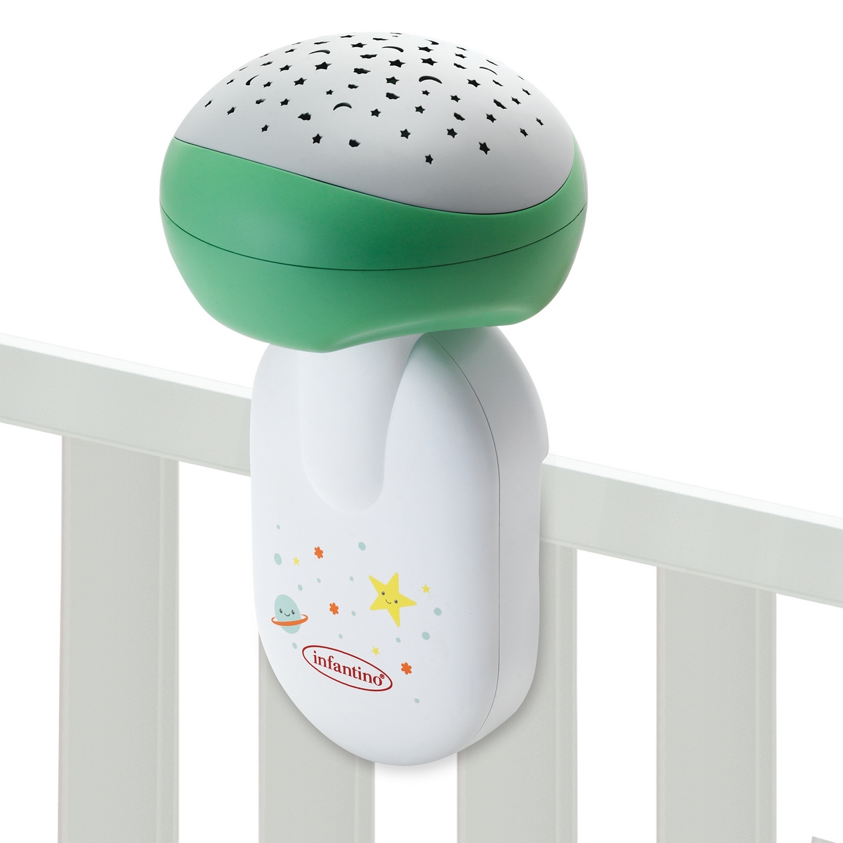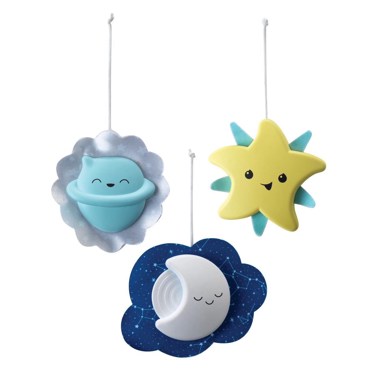 Wielofunkcyjny projektorek, wyświetla kolorowe gwiazdki oraz gra kojące melodie, które uspokajają dziecko pomagając mu zasnąć. Na karuzeli, przy dźwiękach muzyki kręcą się urocze zawieszki.