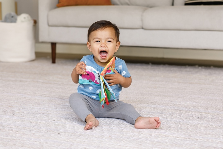 Kolorowa książeczka wyposażona w gryzaczek o różnych fakturach. Zawiera 4 strony – na każdej 2 inne zwierzątka. Ostatnia strona zawiera piszczałkę, a strony szeleszczą co zwróci uwagę dziecka. Książeczka posiada kółeczko z zaczepem i tasiemkę dzięki czemu można ją przywiesić w dowolnym miejscu. Pasuje do wózków, fotelików samochodowych, mat. Jasne, kontrastowe kolory zaangażują dziecko wzrokowo. Bez BPA. Wiek: 0M+