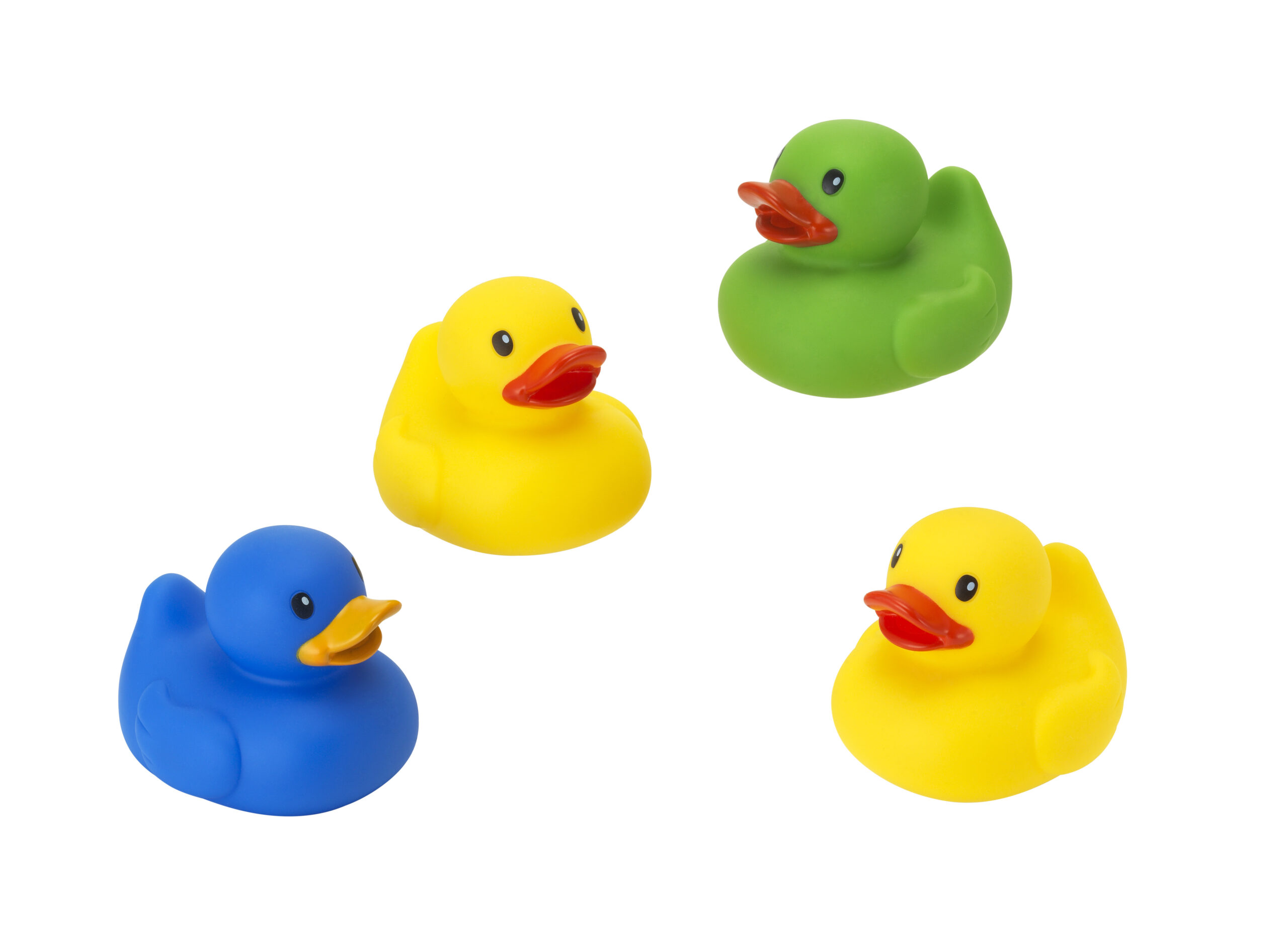 4 klasyczne kaczuszki kąpielowe w różnych kolorach. Zapakowane w ozdobne pudełko w kształcie domku, dzięki czemu zestaw idealnie nada się na prezent Wiek: 0M+