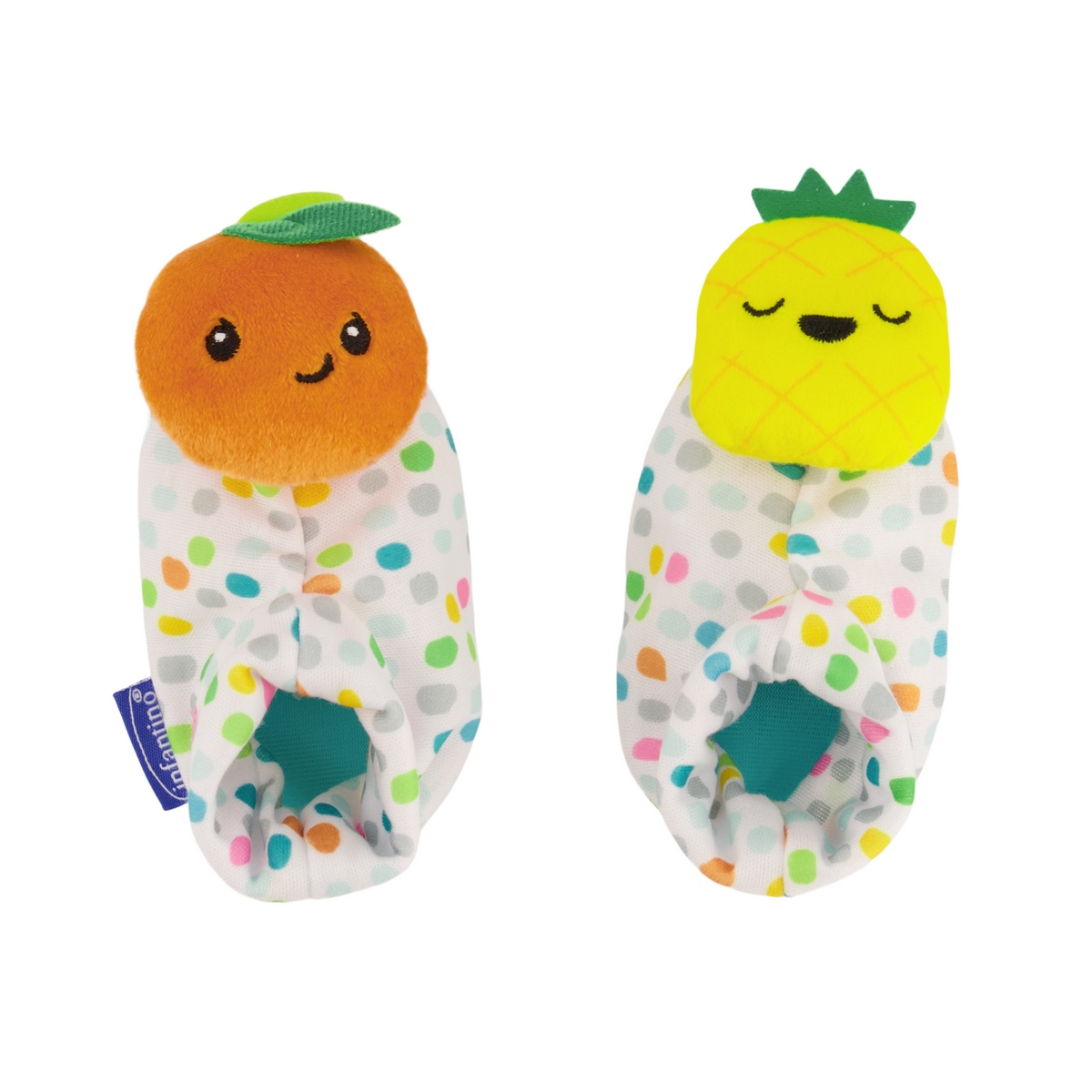 1) GRZECHOTKI NA NADGARSTEK – 2 Grzechotki, które nie wymagają dodatkowego wysiłku od dziecka, bo będą grzechotać z każdym jego naturalnym ruchem! Miękkie grzechotki owoce są wygodne i lekkie, idealnie pasują do małych rączek.