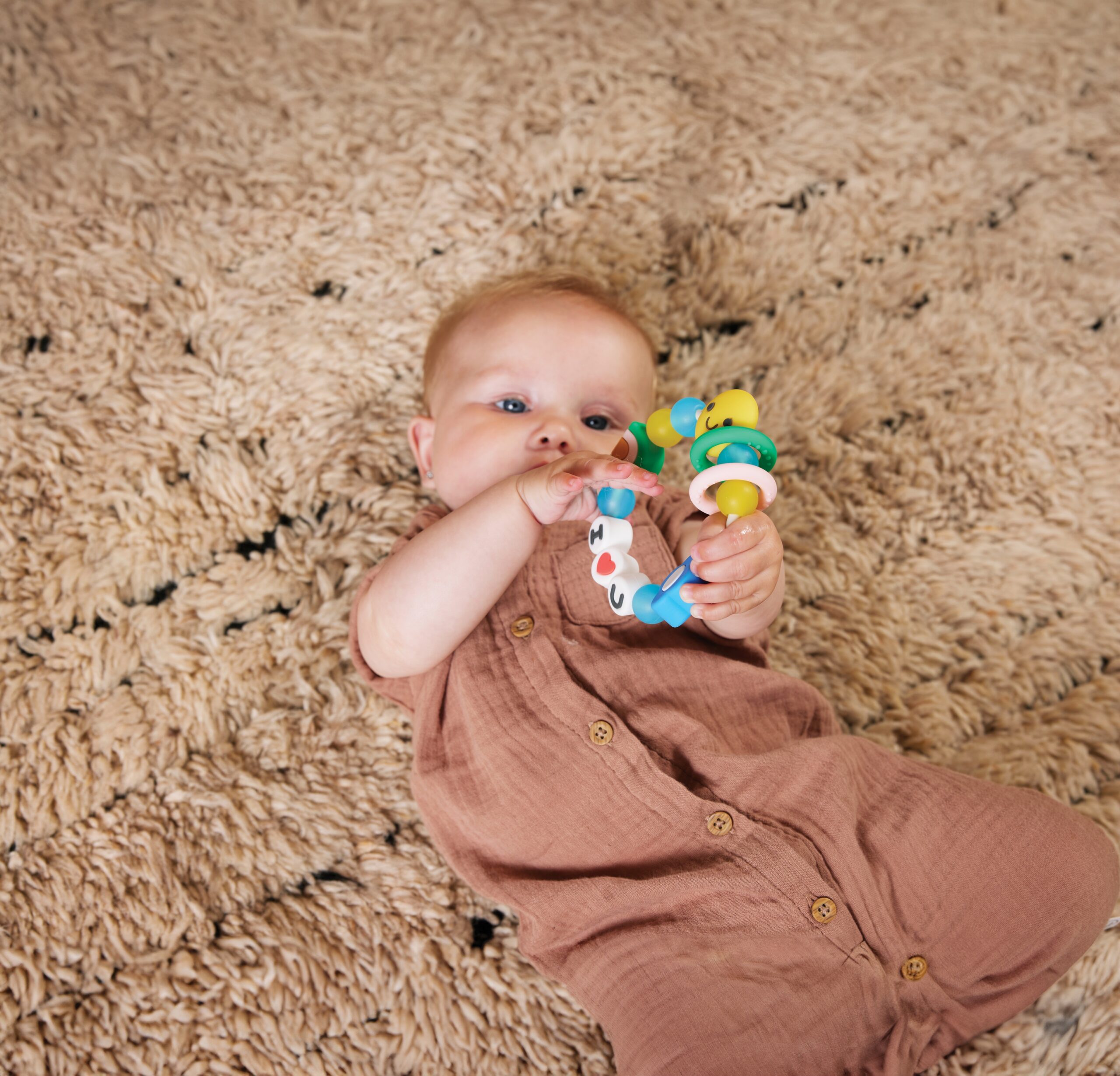 Krążek z kolorowymi grzechoczącymi koralikami o różnych fakturach inspirowany popularnymi bransoletkami przyjaźni. Idealny rozmiar dla dziecięcych rączek. Grzechocze po potrząśnięciu. Wiek: 0M+