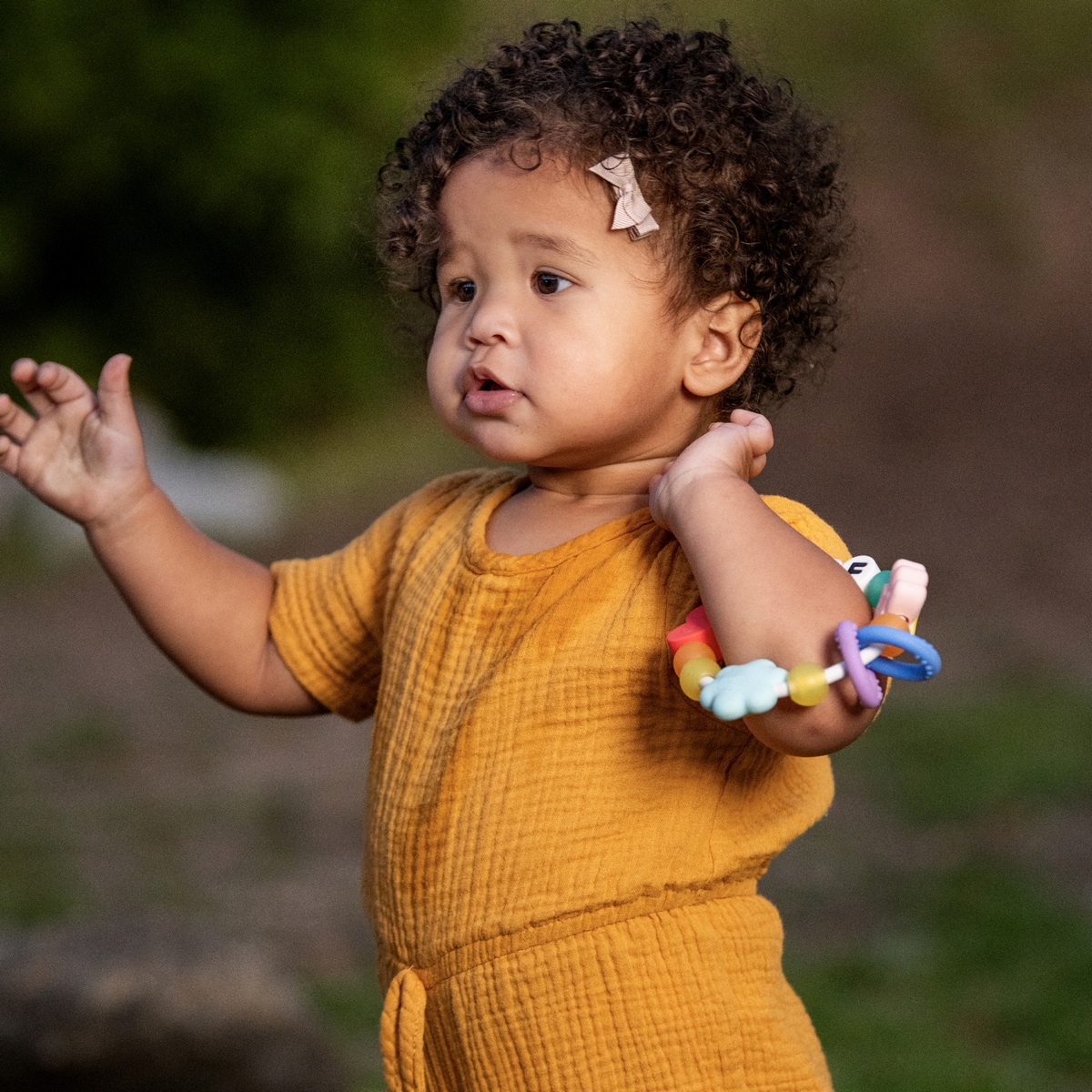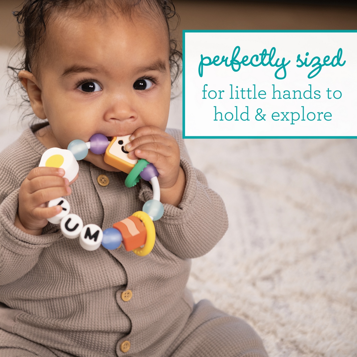 Krążek z kolorowymi grzechoczącymi koralikami o różnych fakturach inspirowany popularnymi bransoletkami przyjaźni. Idealny rozmiar dla dziecięcych rączek. Grzechocze po potrząśnięciu. Wiek: 0M+