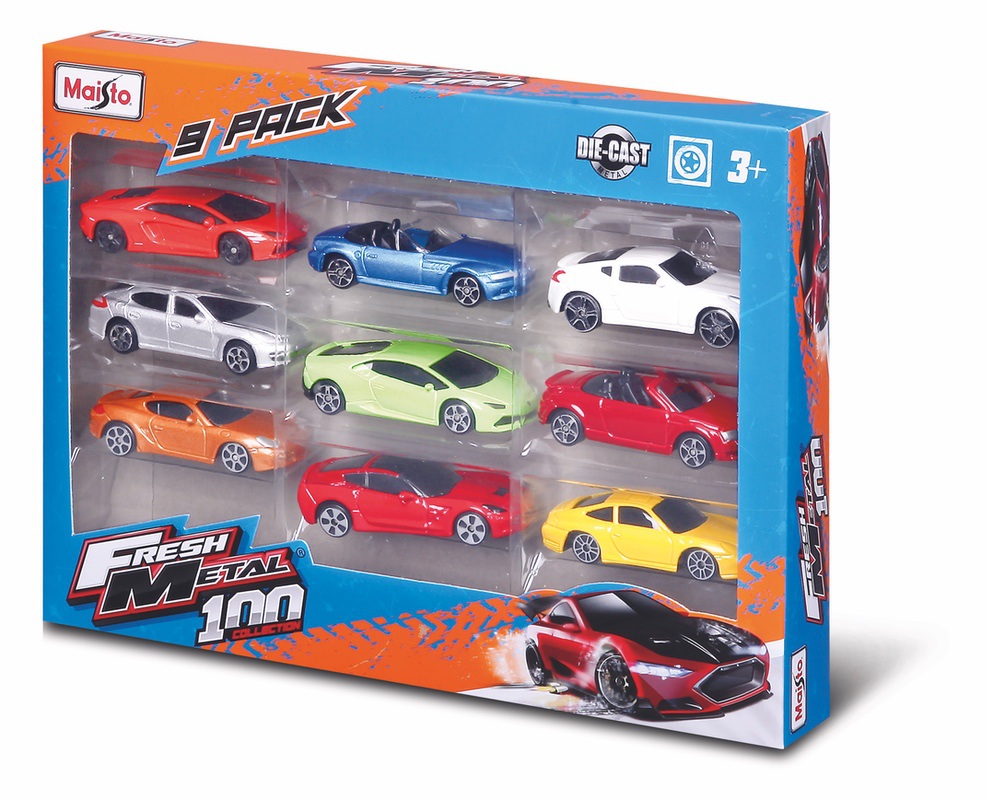 Zestaw 9 modeli Fresh Metal w opakowaniu z okienkiem. W asortymencie różne modele i kolory 3-calowych metalowych aut.