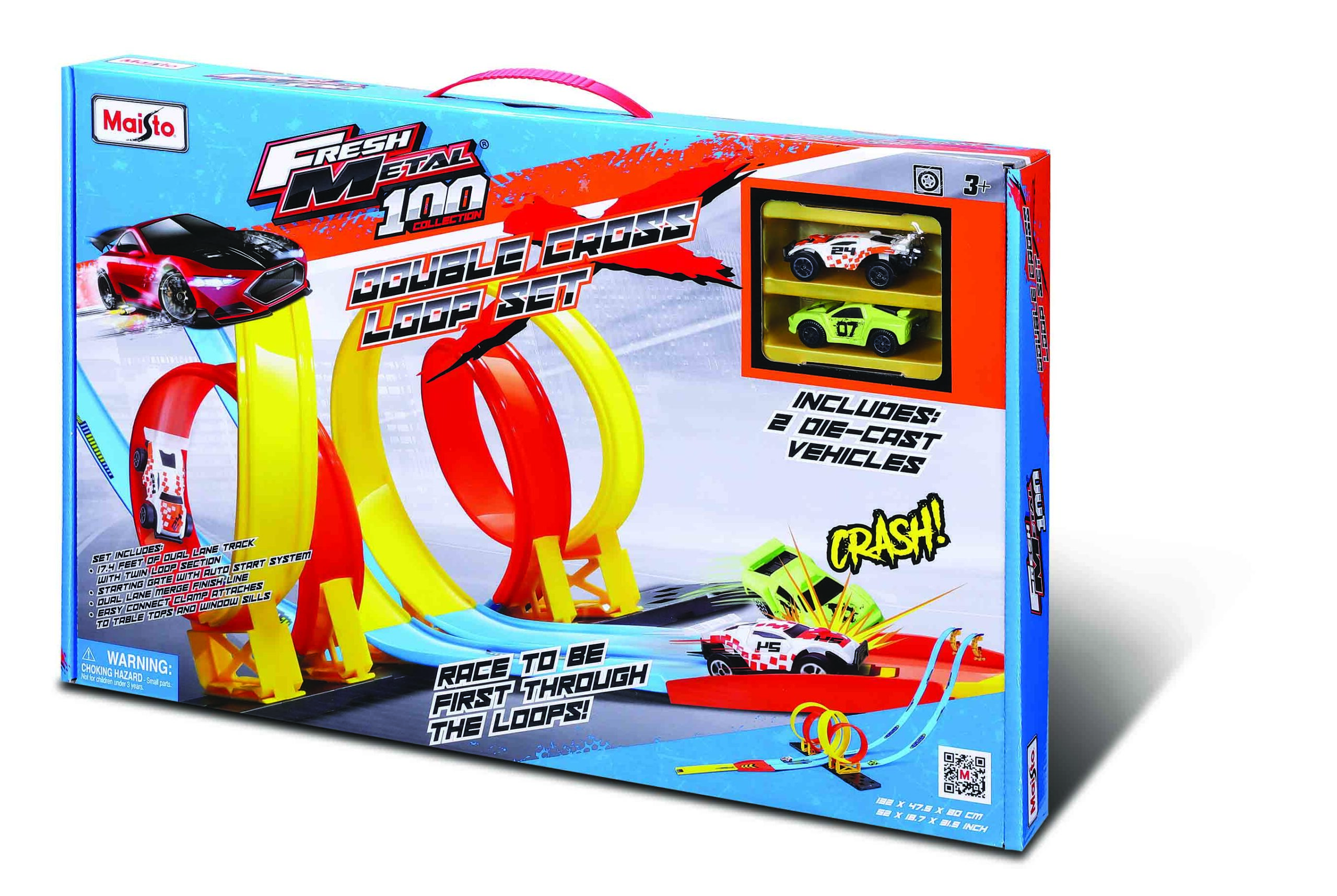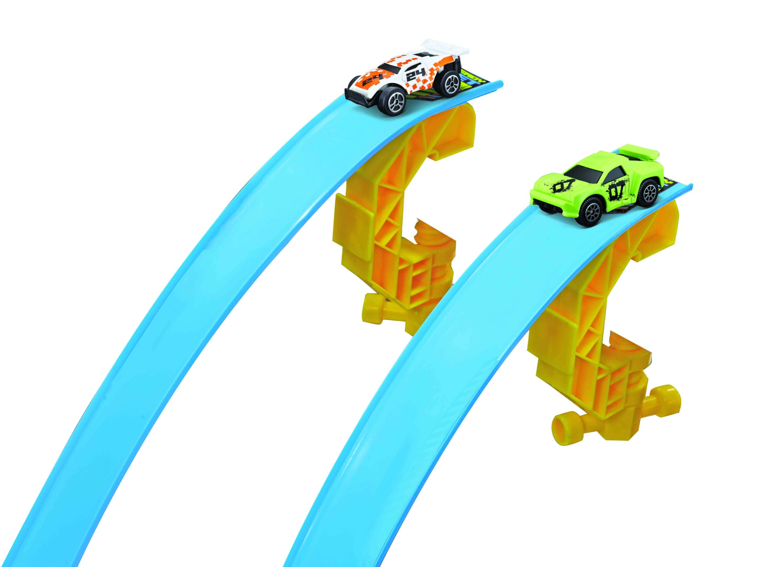 Tor z 2 podwójnymi pętlami i wyrzutnią. W zestawie 2 autka die-cast do urządzania wyścigów. Maksymalne wymiary toru po rozłożeniu: 132×47,5×80 cm.