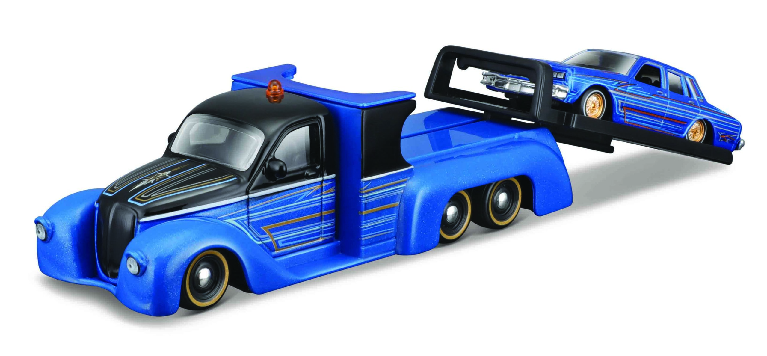 Zestaw dwóch samochodzików: ciężarówka z lawetą i autko osobowe w skali 1:64, opakowanie: blister z podstawką. Wiek: 8+