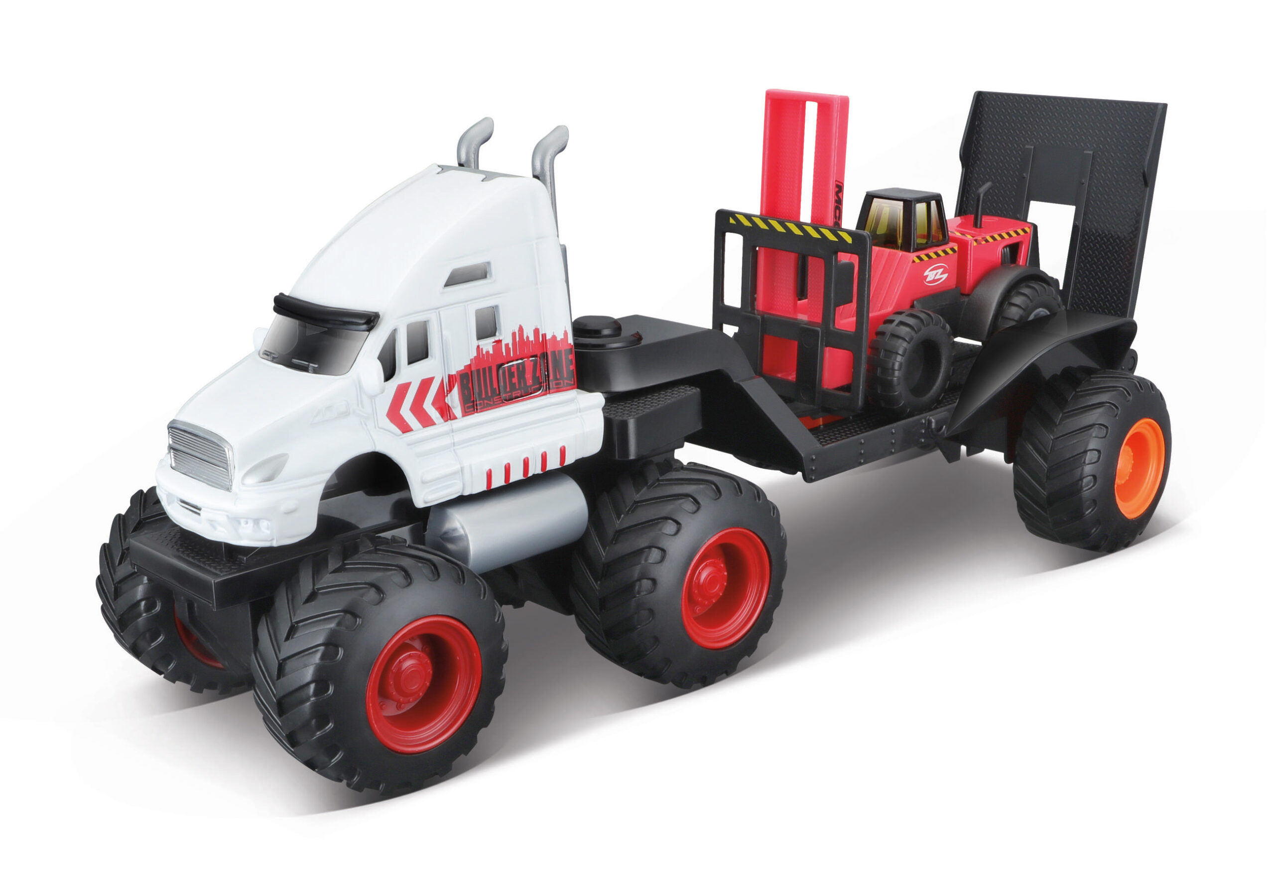 Ciężarówka budowlana z wielkimi oponami. W zestawie z lawetą i podnośnikiem widłowym. Szt./karton: 6