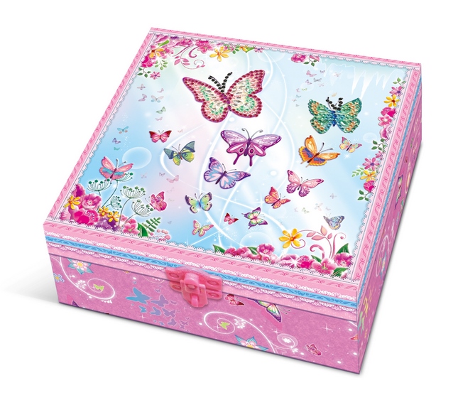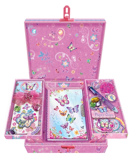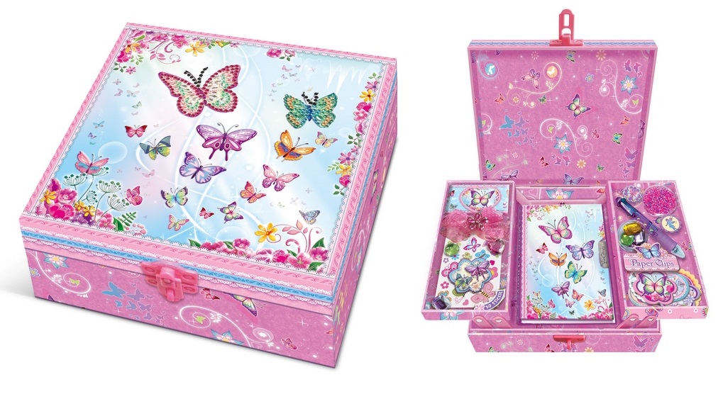 Zestaw zapakowany w ozdobne pudełko z 2 półeczkami, które można rozłożyć na boki, a pod nimi schować pamiętnik.