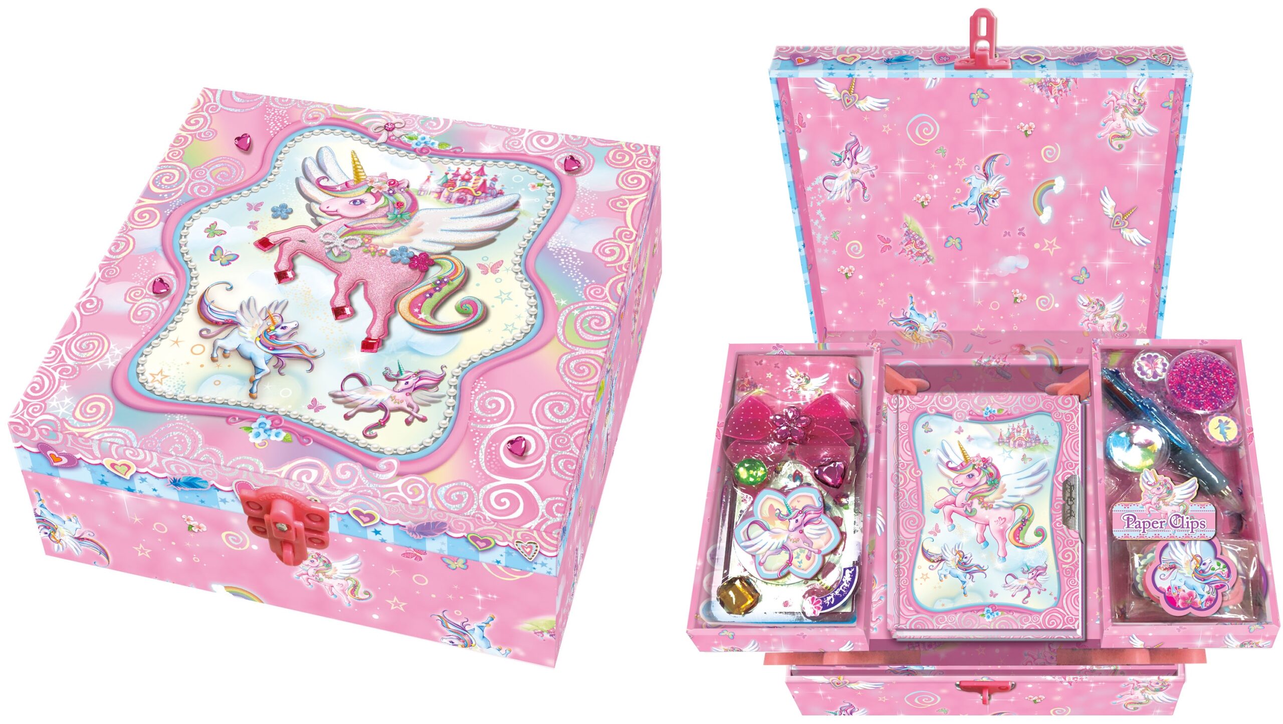 Zestaw zapakowany w ozdobne pudełko z 2 półeczkami, które można rozłożyć na boki, a pod nimi schować pamiętnik.