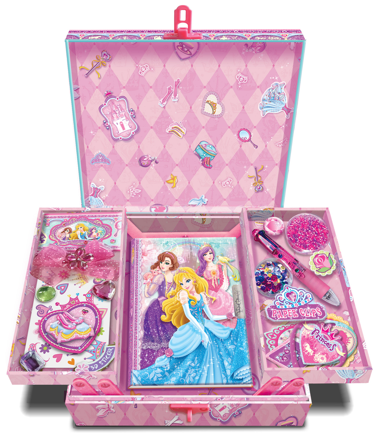 Zestaw zapakowany w ozdobne pudełko z 2 półeczkami, które można rozłożyć na boki, a pod nimi schować pamiętnik.