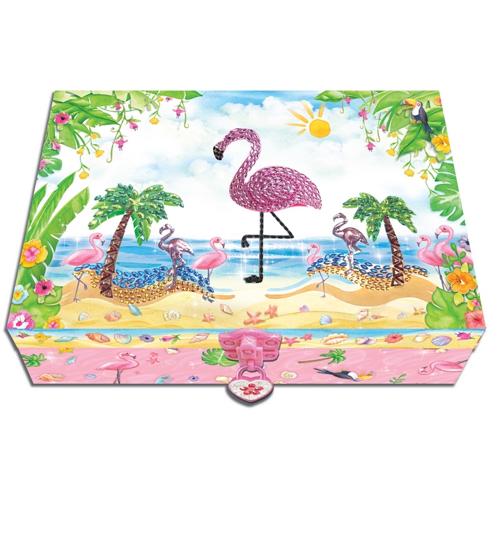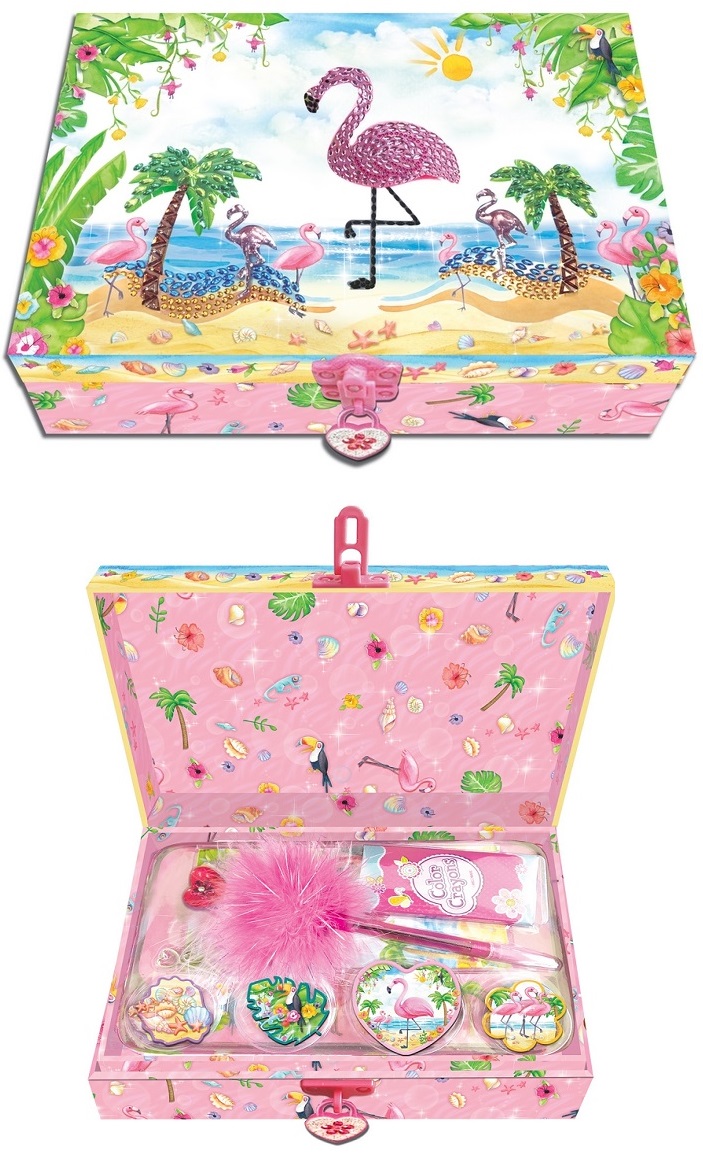 Zestaw zapakowany wozdobne pudełko-szkatułkę zamykane na kłódeczkę.