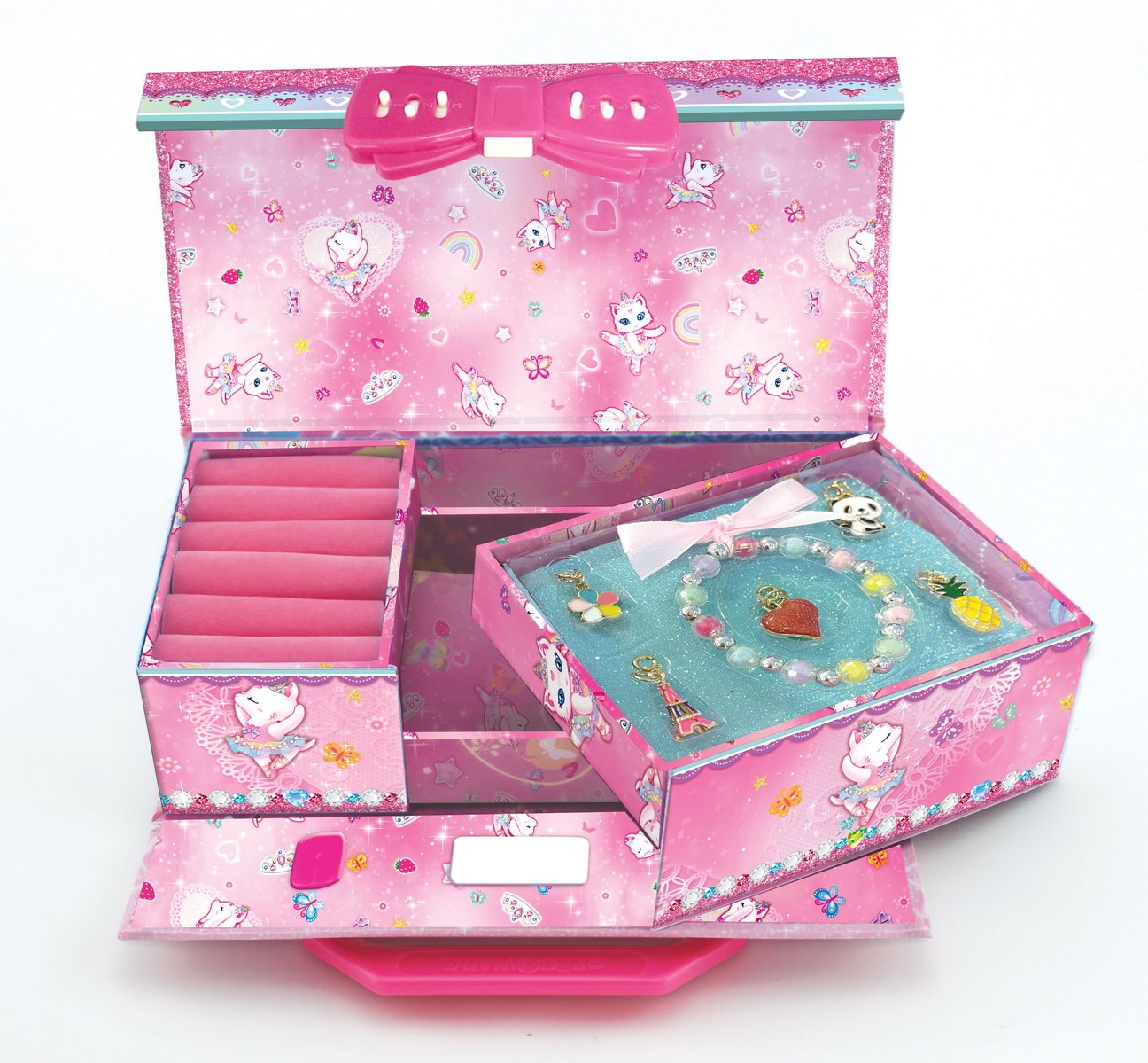 Szkatułka zamykana na zamek z szyfrem. W zestawie znajduje się bransoletka i 5 zawieszek typu ‘charms’ do dowolnego ozdabiania. Wiek: 6+