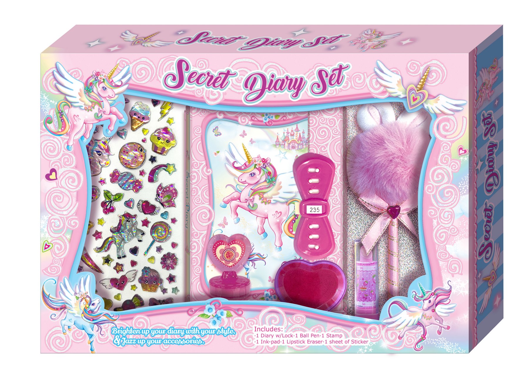 Pamiętnik zamykany na zamek z szyfrem. W zestawie znajduje się ozdobny długopis i akcesoria do dekorowania. Wiek: 6+