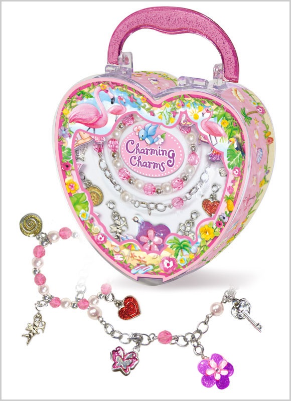 Zestaw naszyjnik + bransoletka oraz 7 zawieszek typu charms do dowolnego ozdabiania. Zapakowany w ozdobne plastikowe pudełko serduszko z uchwytem. Wiek: 6+