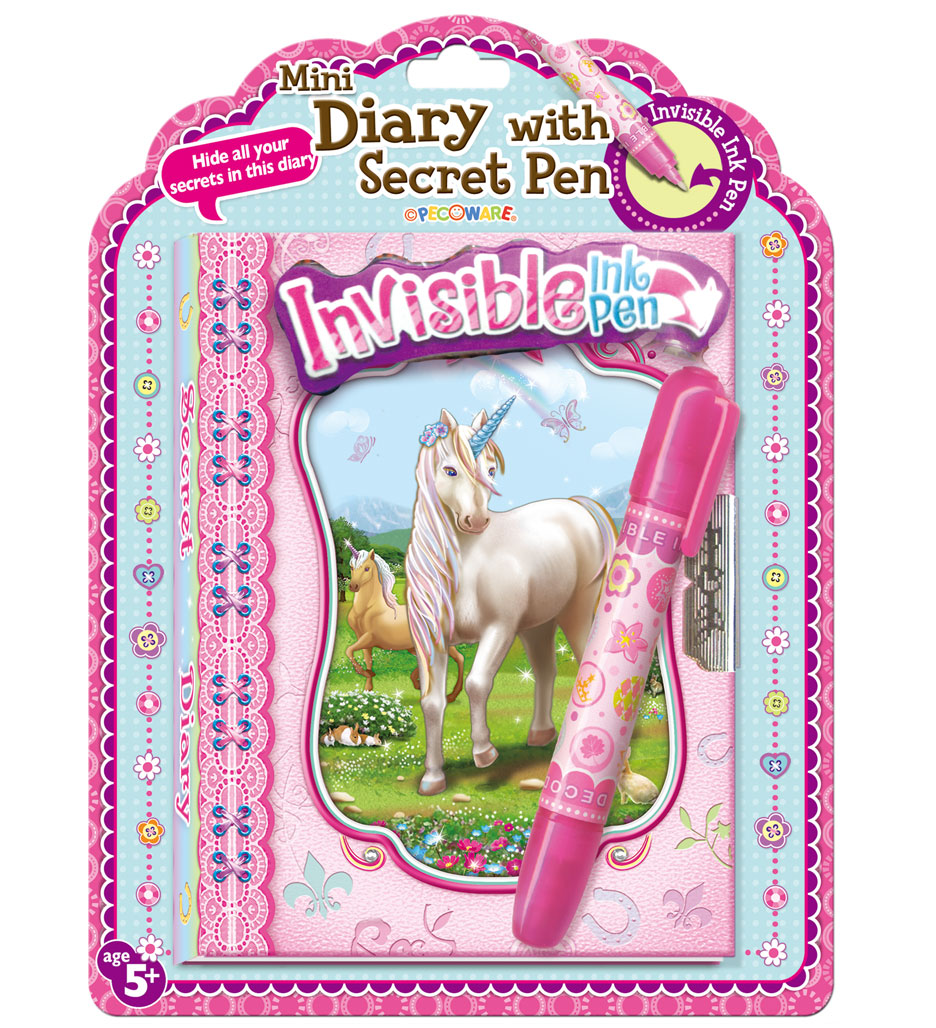 Dzięki małemu rozmiarowi będzie idealny jako pierwszy pamiętnik. Zawiera kartki z liniami na drobne zapiski, a bogate zdobienia i dekoracje przyciągną wzrok. Jedna końcówka długopisu pisze „niewidzialnym” tuszem, który będzie widoczny dopiero po zamalowaniu go drugą końcówką. W zestawie 2 kluczyki do otwierania zamka. Wiek: 5+