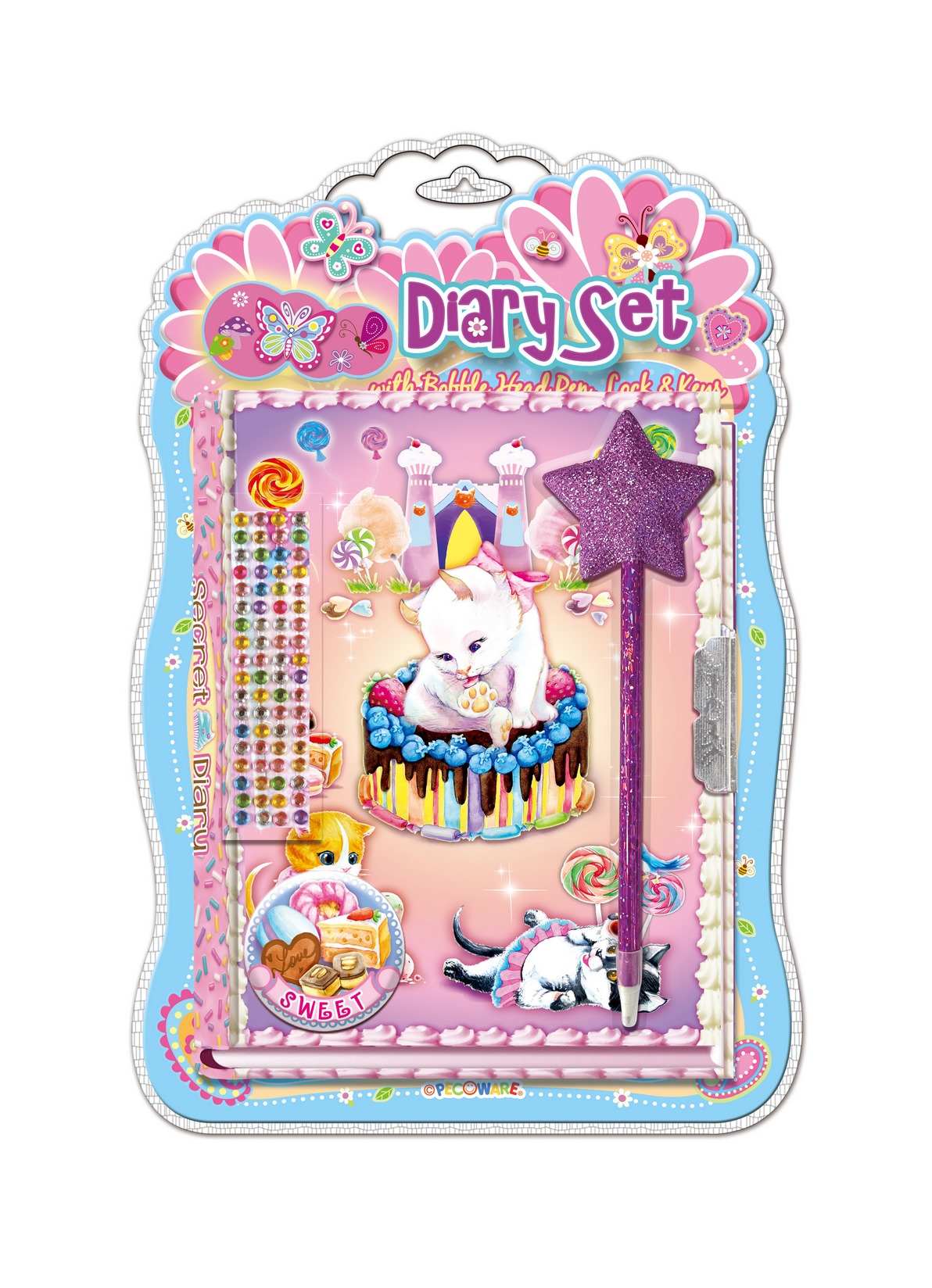 Gruby pamiętnik z kolorowymi kartkami zamykany na zamek. W zestawie znajduje się ozdobny długopis, naklejka 3D, cekiny samoprzylepne do ozdabiania oraz 2 kluczyki do zamka. Wiek: 6+